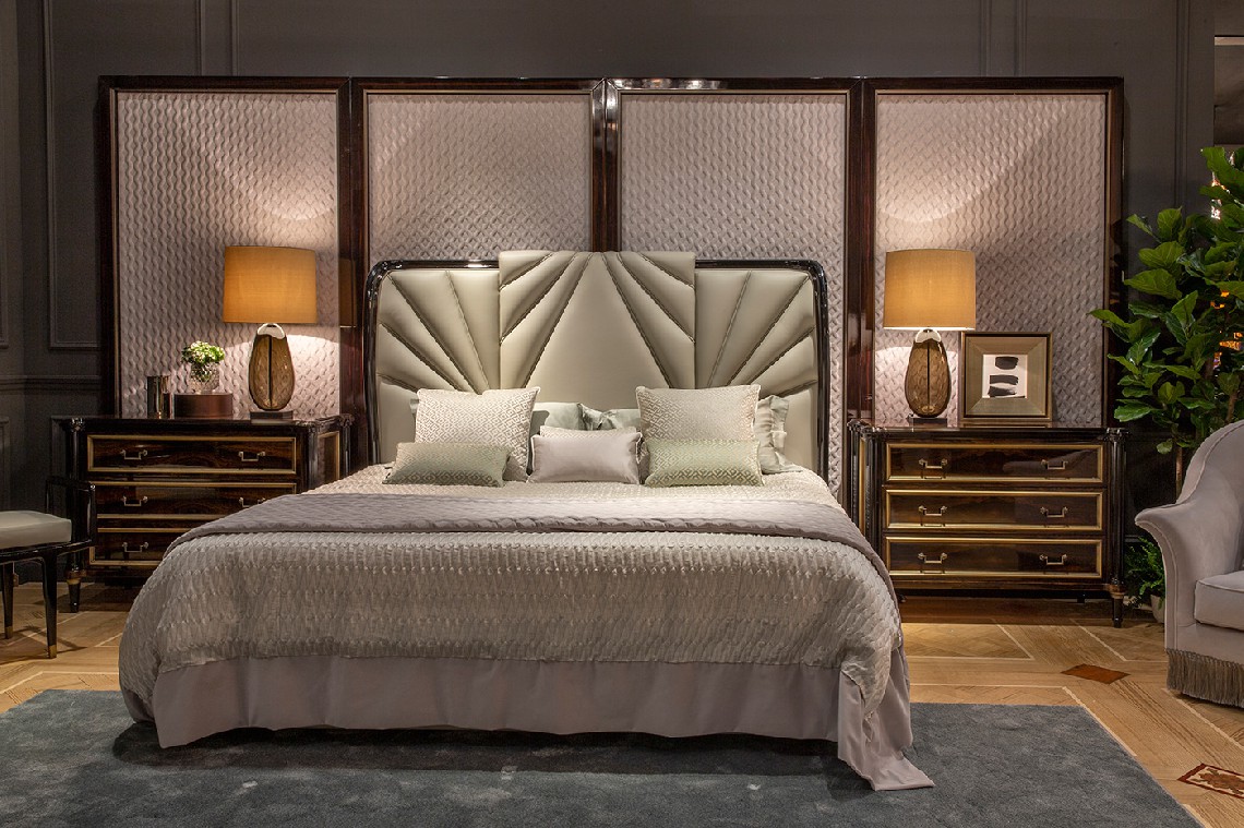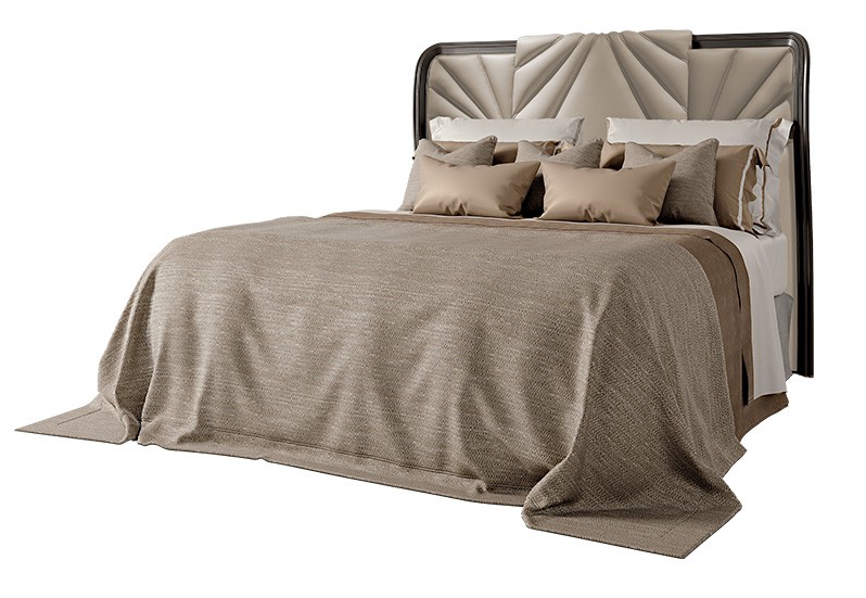 King Size Bed. Solid wood structure in ebony-coloured polishing. Headboard with topside padding. Sommier base completely padded. Upholstered in fabric or leather.