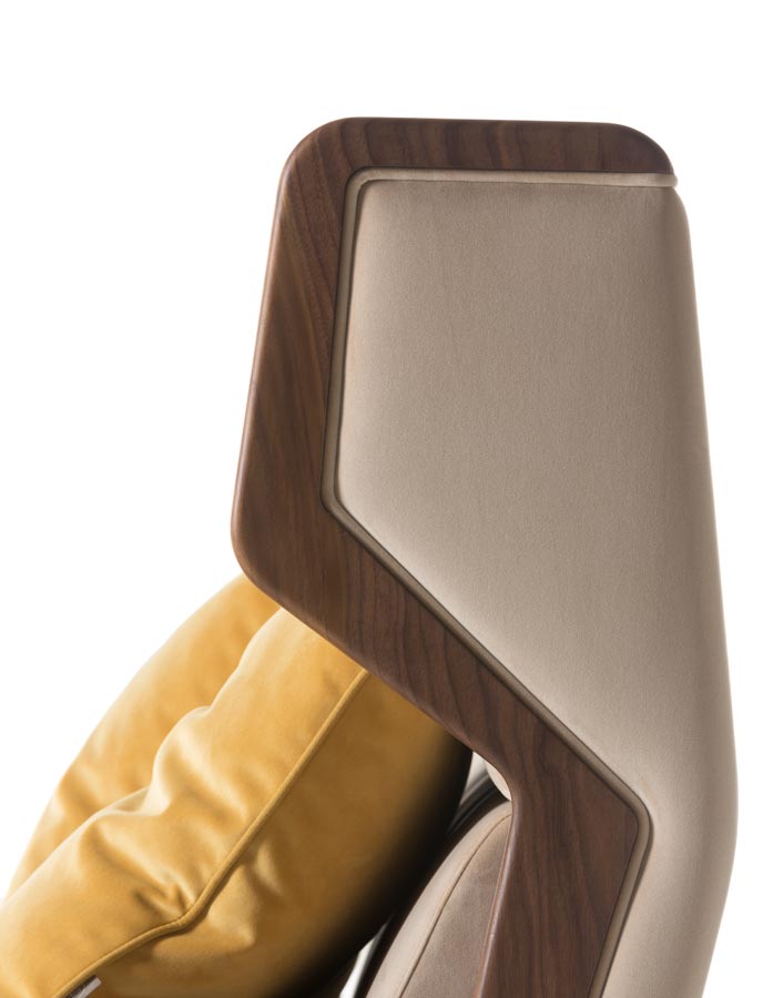 Bed structure in wood and upholstered headboard covered with fabric or leather.