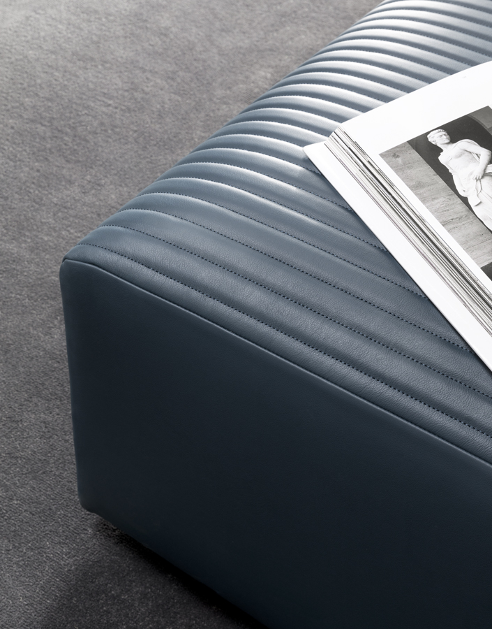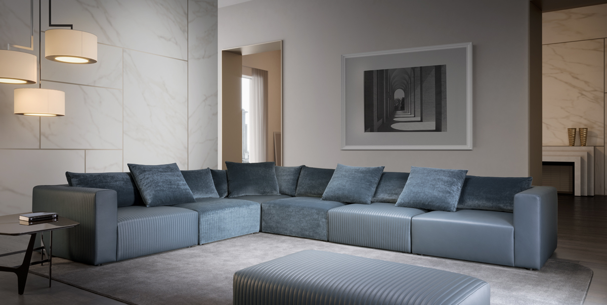 Divano componibile imbottito con rivestimento in tessuto o pelle.