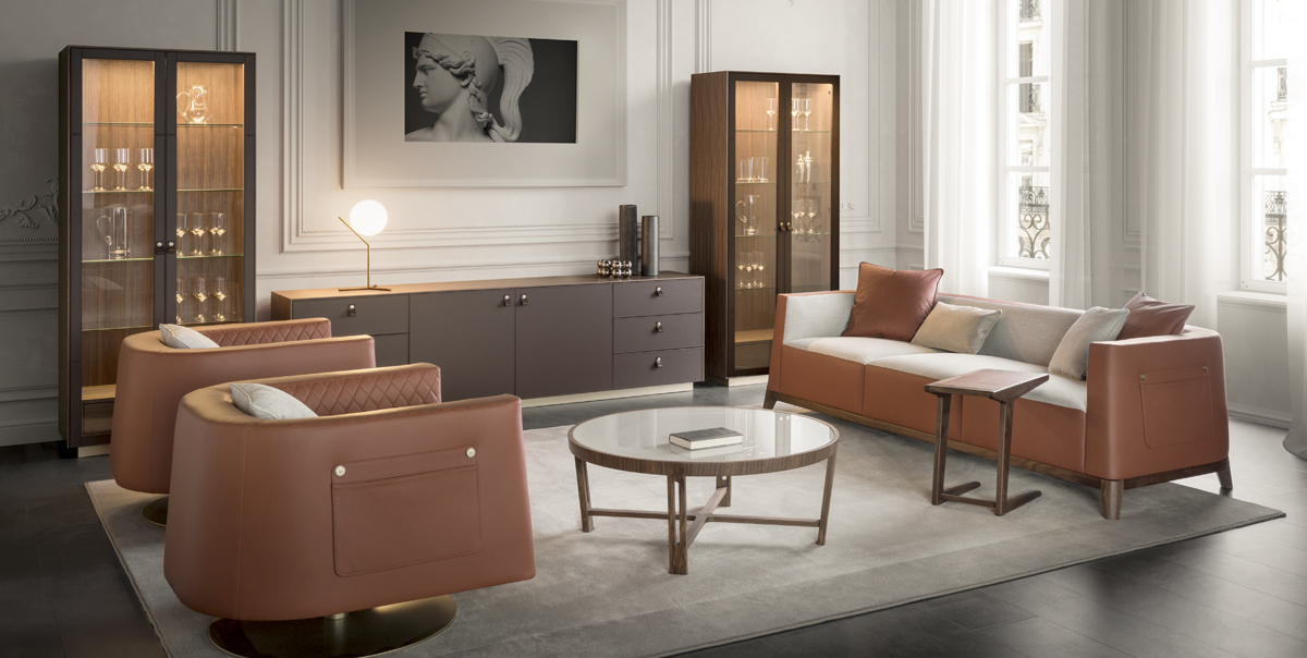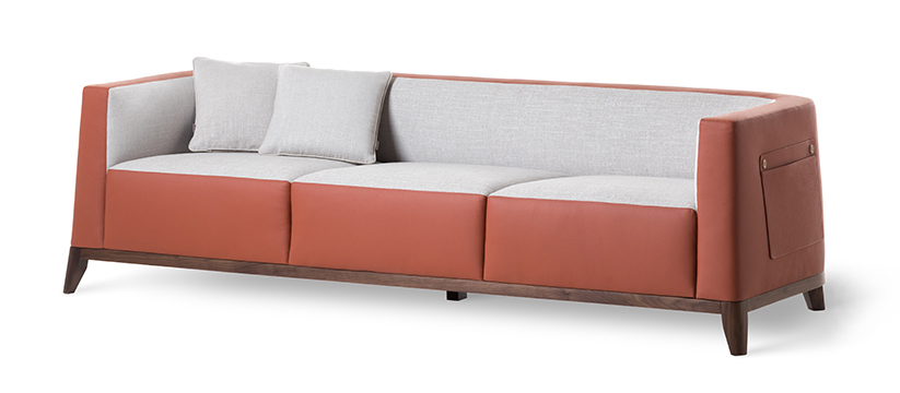 Divano 3 posti con struttura in legno, rivestimento tessuto o pelle.