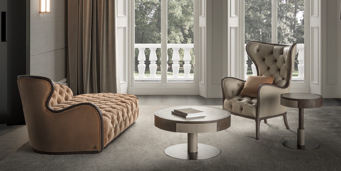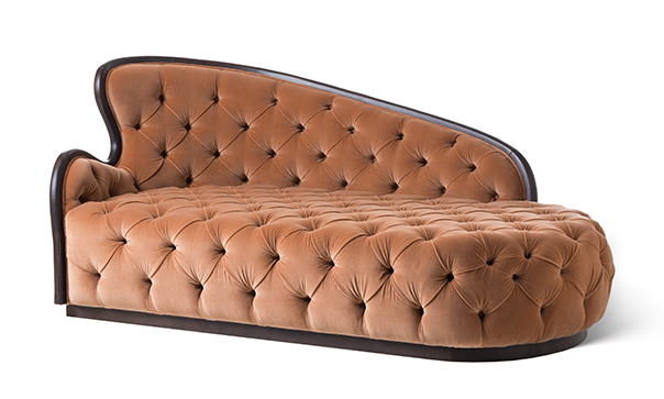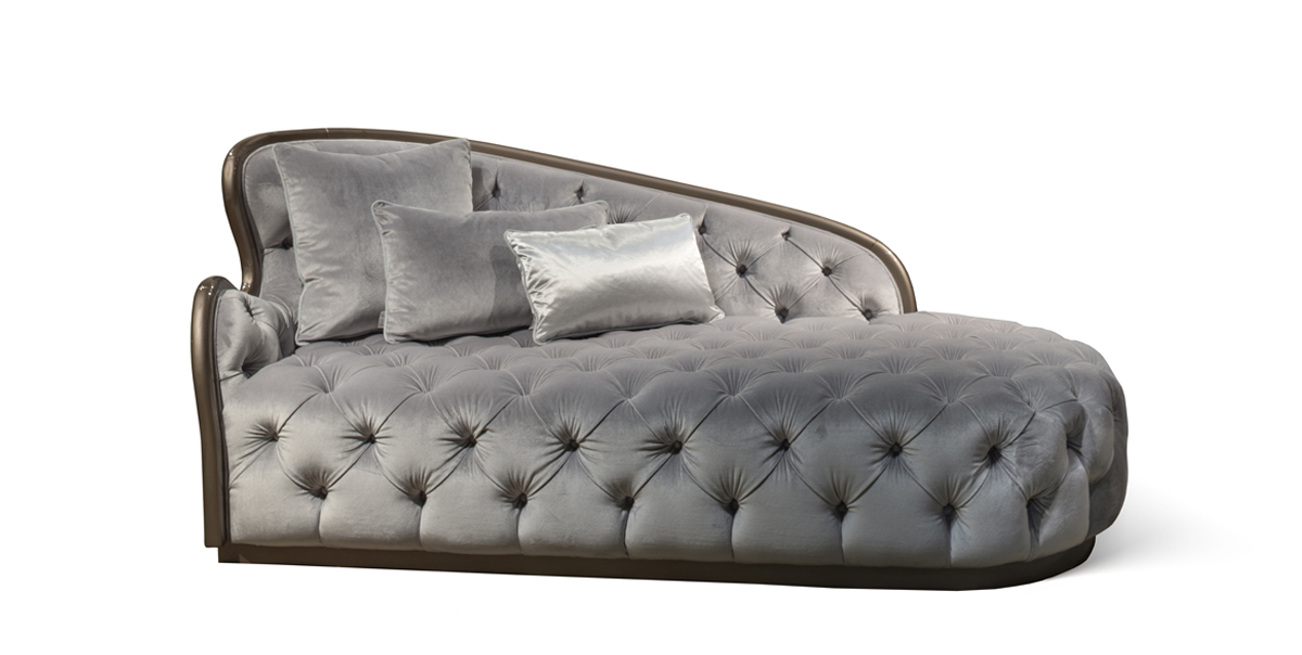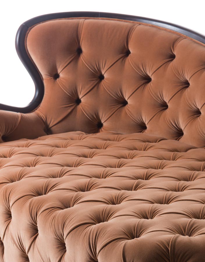 Dormeuse with wooden structure and capitonè finish. Upholstery in fabric or leather. Basement in wood.