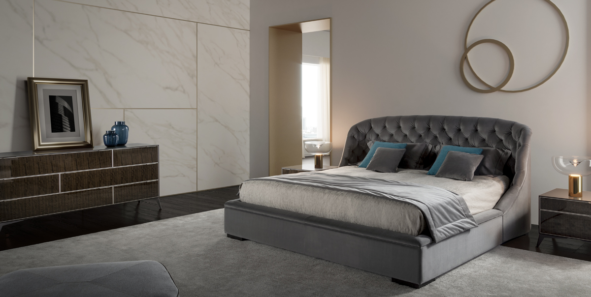 Letto imbottito con piedi laccati color argento satinato. Rivestimento tessuto o pelle.