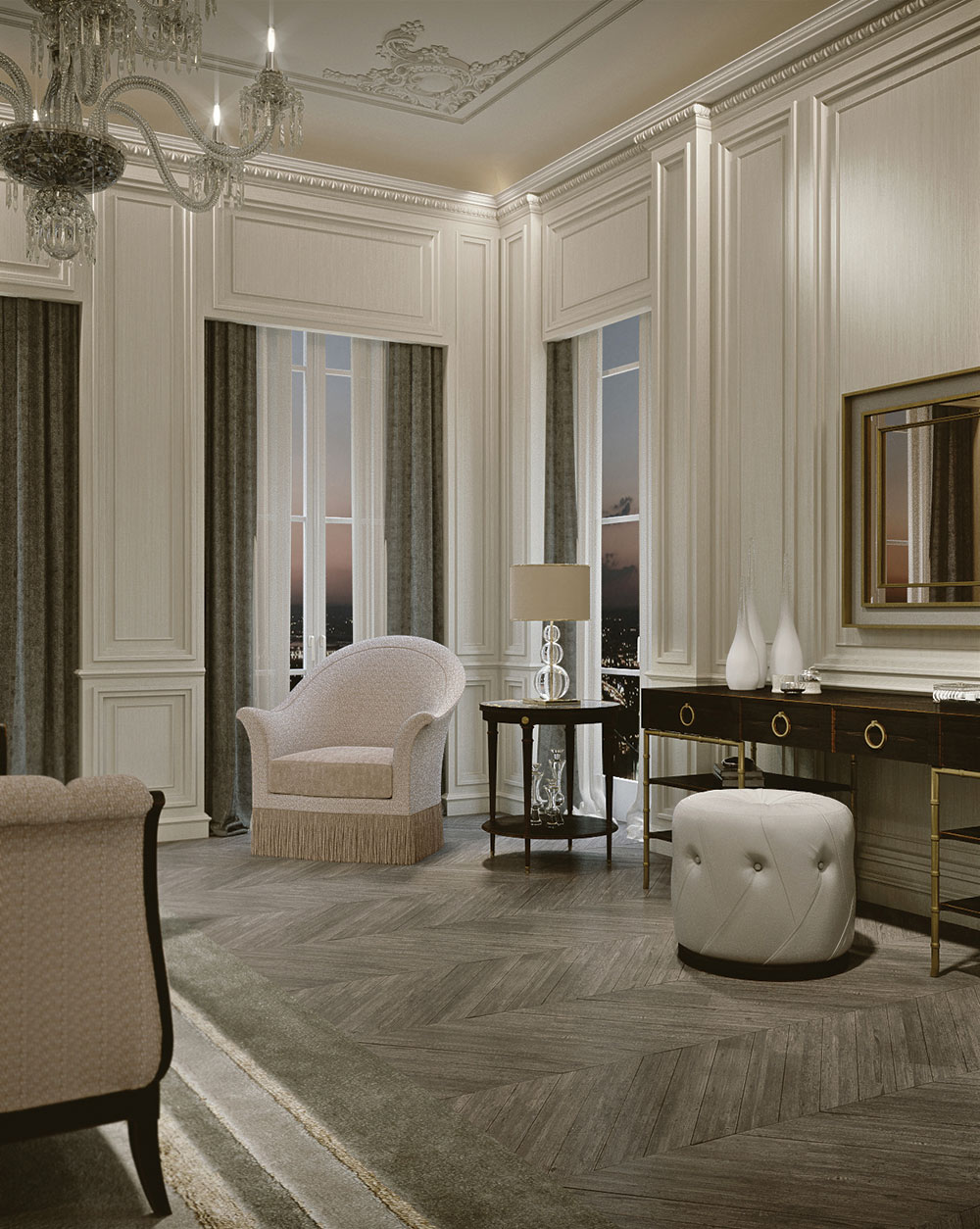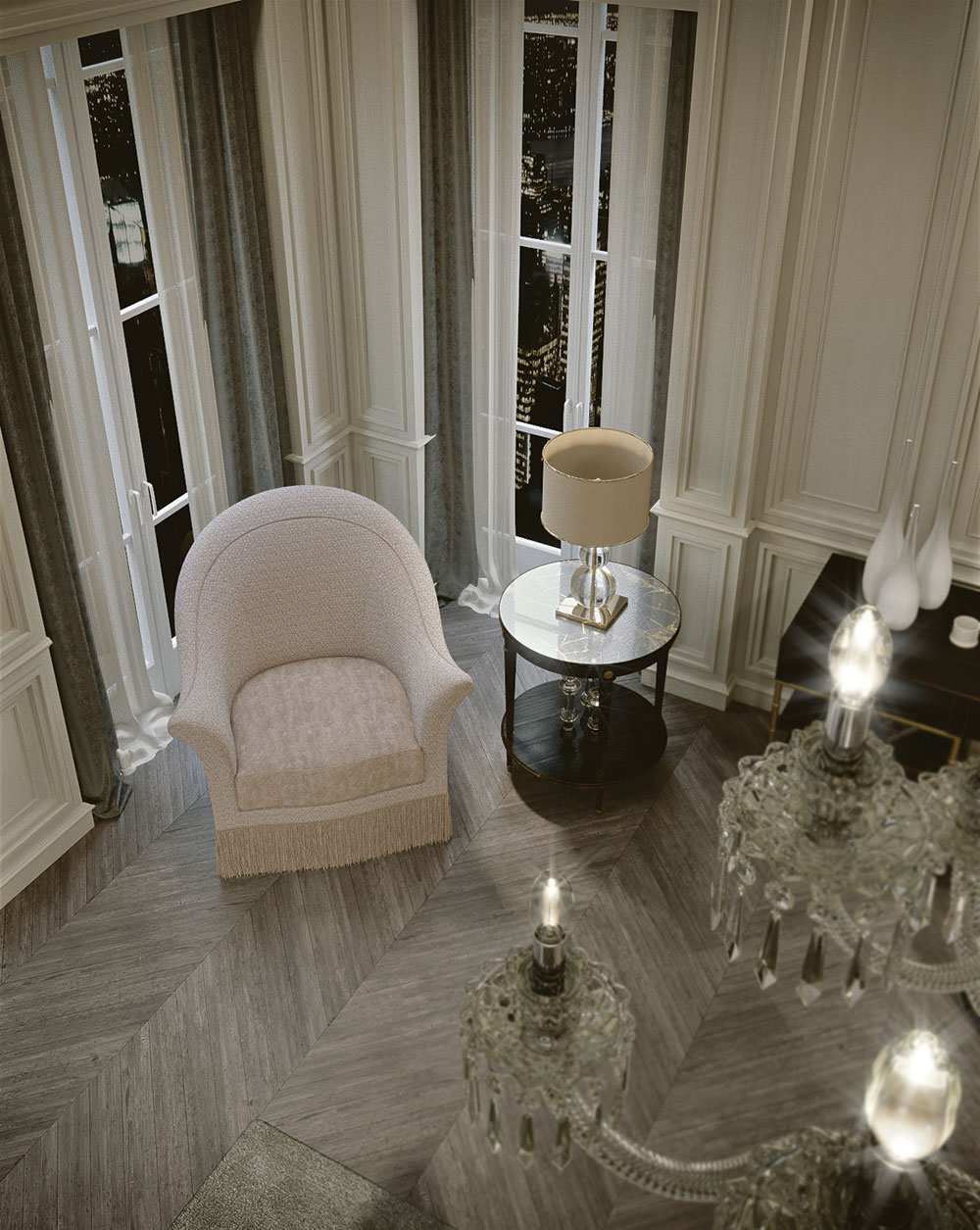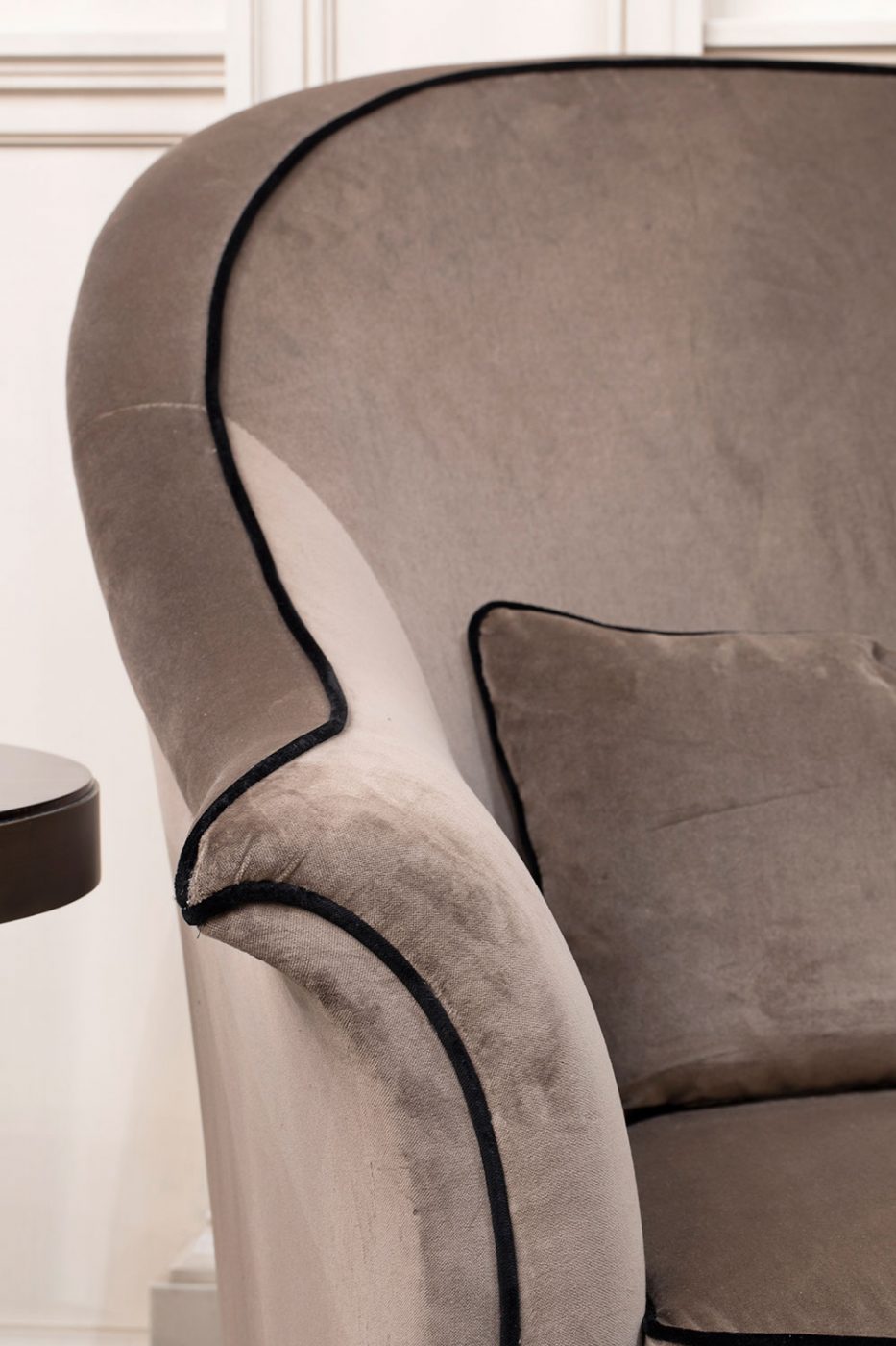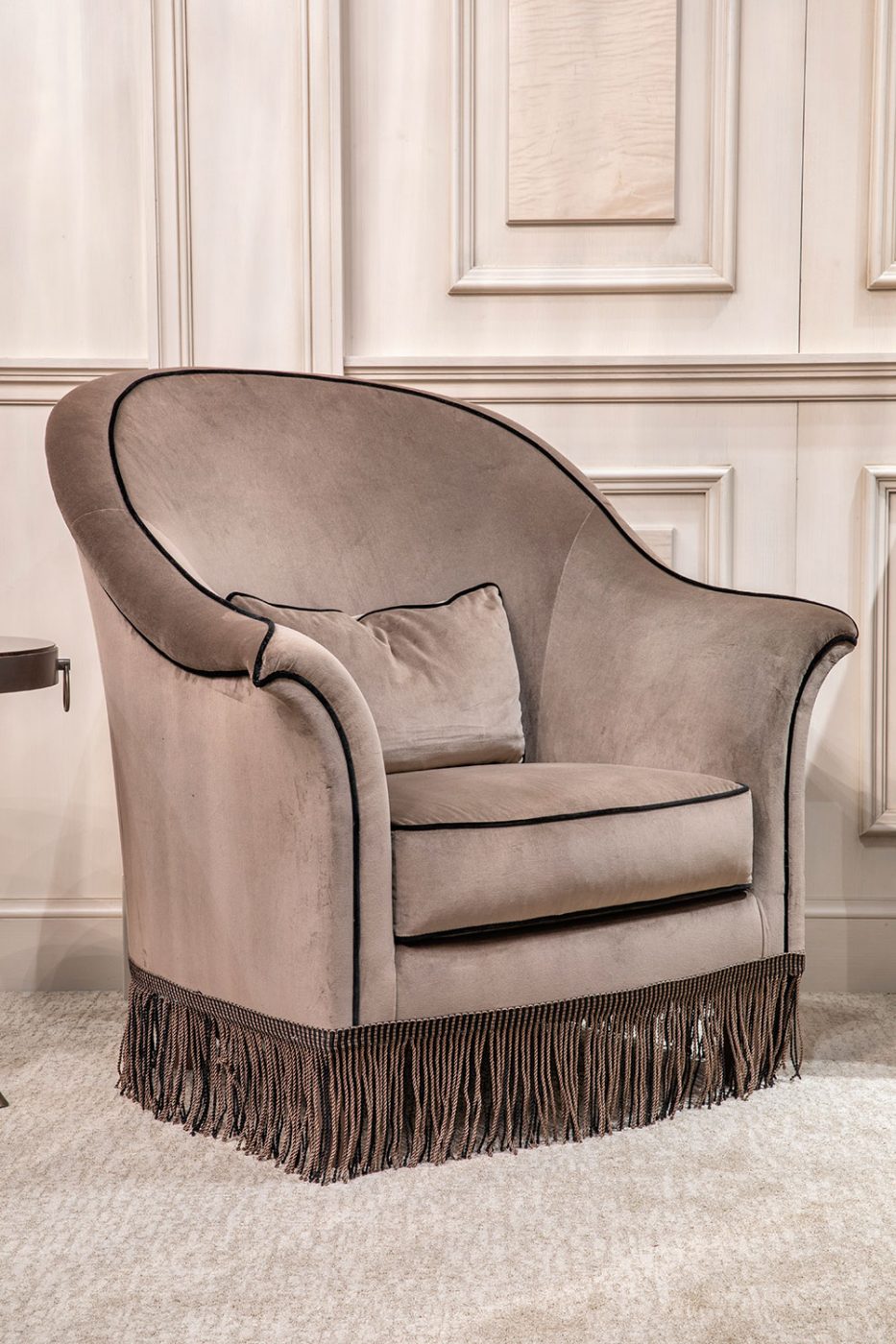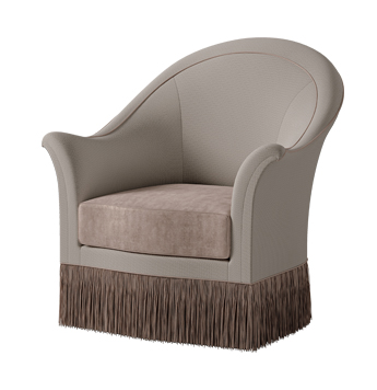 Poltrona. Struttura in legno massello completamente imbottita. Rivestimento in tessuto o pelle. Base con passamanerie decorative.
