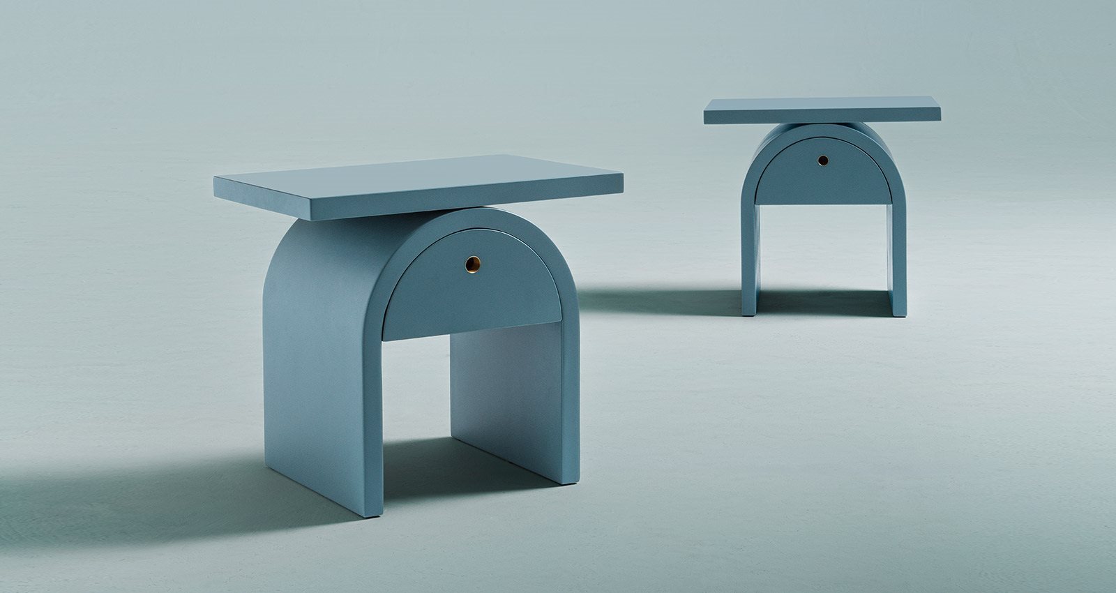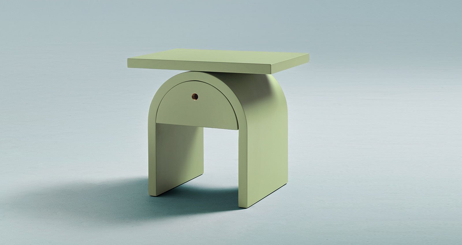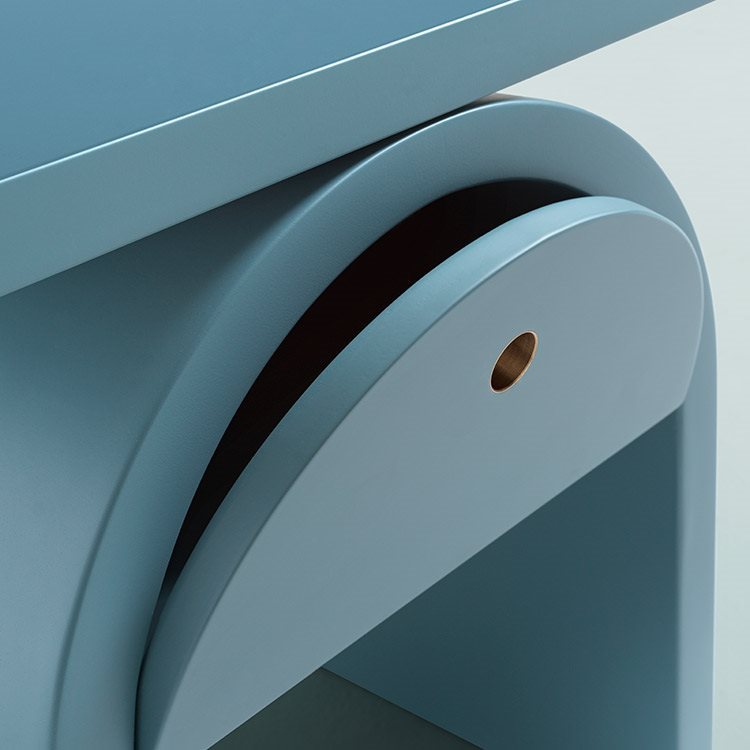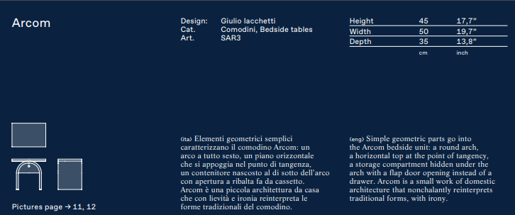 Arcom stands out for the use of simple geometric shapes, assembled with great skill and elegance. A round arch supports a horizontal top at the point of tangency, while a storage compartment for small personal objects is concealed below the arch, with a hatch opening.