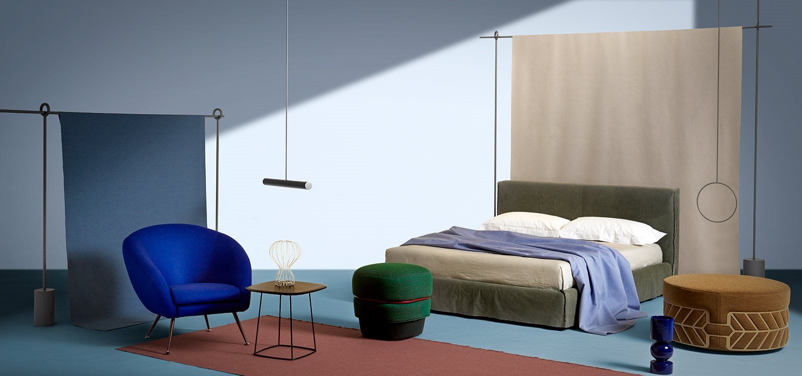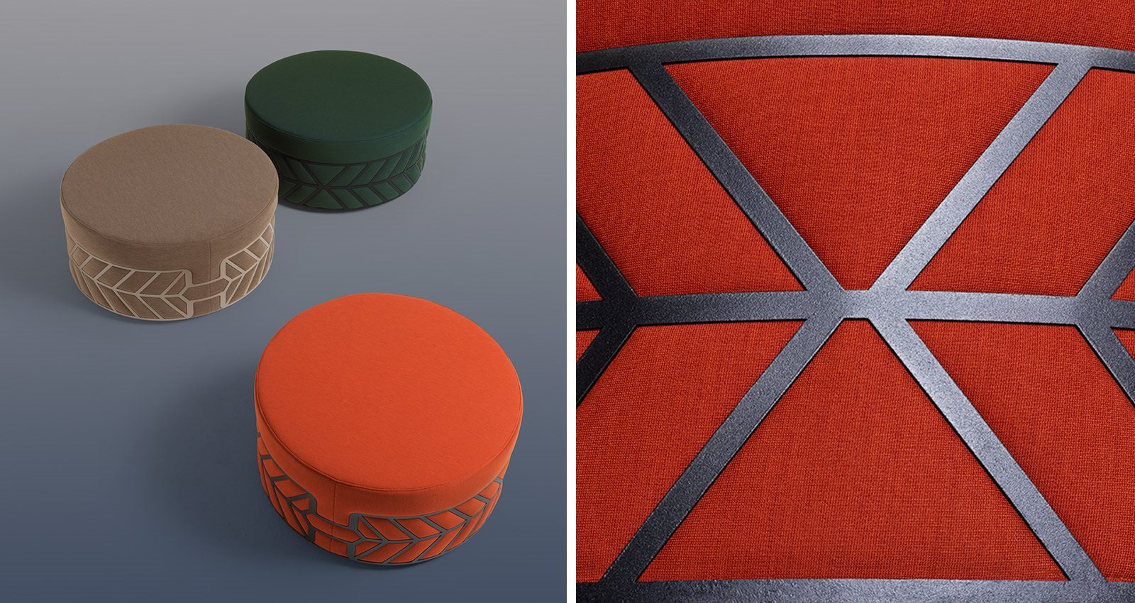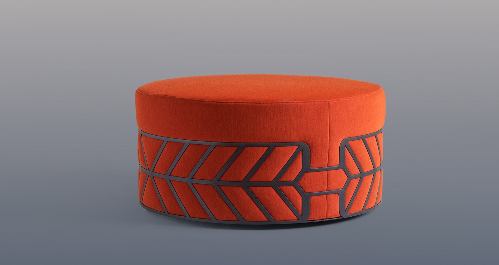 Ottoman. Wooden frame covered with polyurethane foam of different densities and polyester fiber lining. Lacquered steel ring. Fabric removable cover.