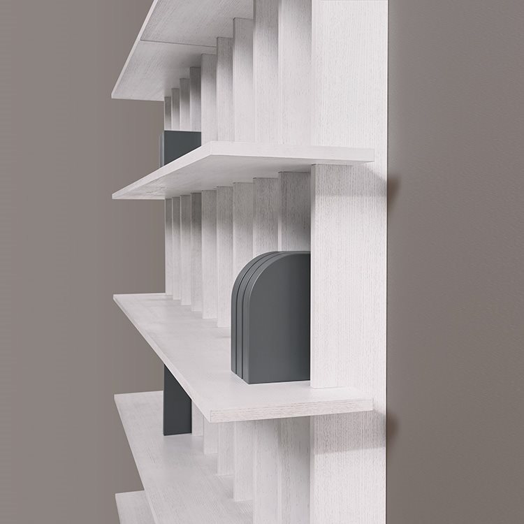 The idea is a cabinet with open, jutting-out shelves which can hold not only books, but also other objects, avoiding the typical “box effect”.
