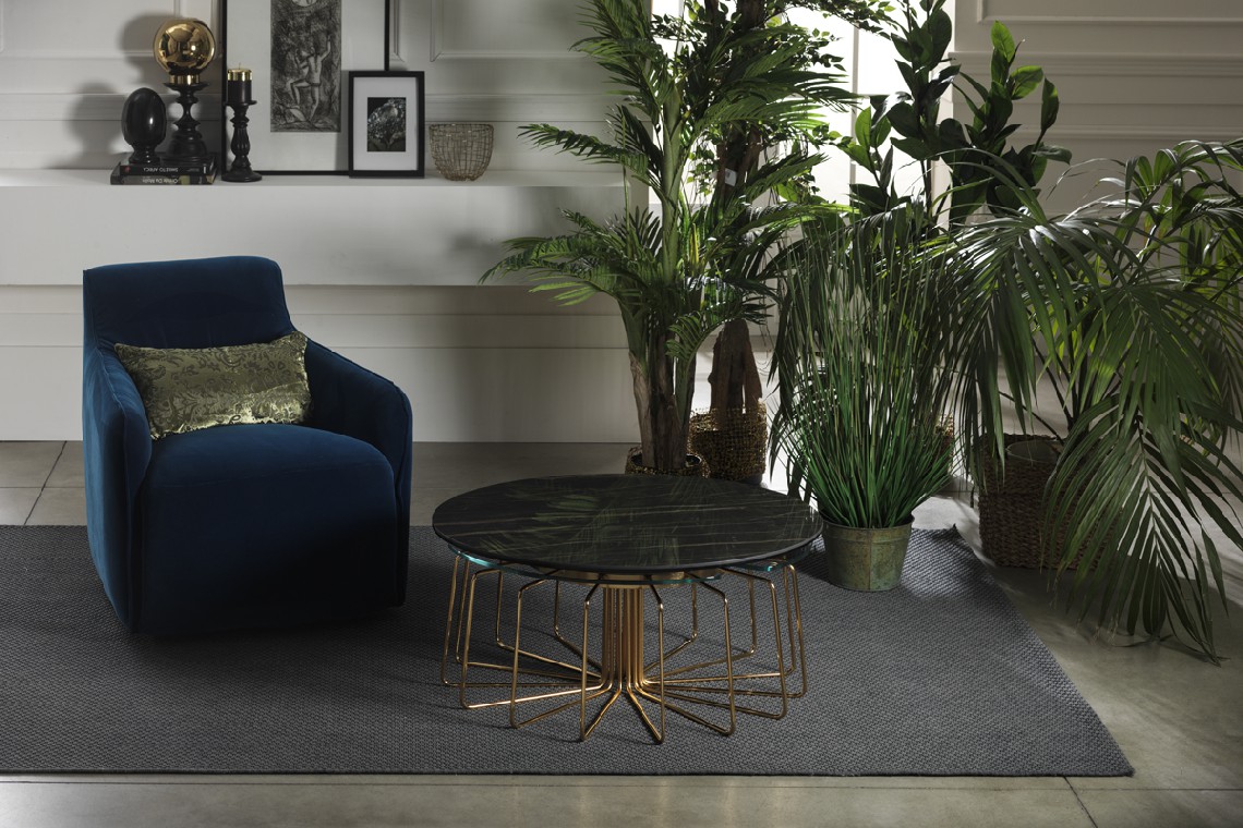 TAVOLINO ESTENSIBILE CON PIANI IN CERAMICA E CRISTALLO, BASE IN ACCIAIO VERNICIATO O GALVANIZZATO. DOTATO DI UN INNOVATIVO MECCANISMO CHE, ATTRAVERSO LA SOLA ROTAZIONE DEL PIANO SUPERIORE, PERMETTE AI TRE PIANETTI SOTTOSTANTI DI APRIRSI.
