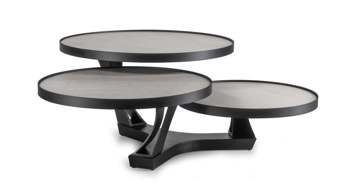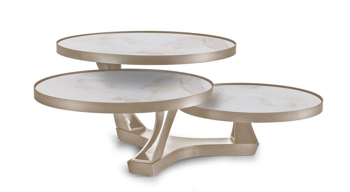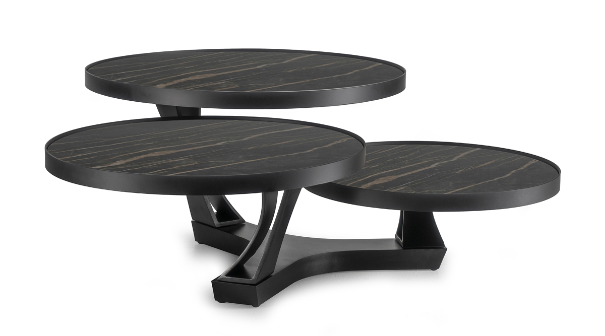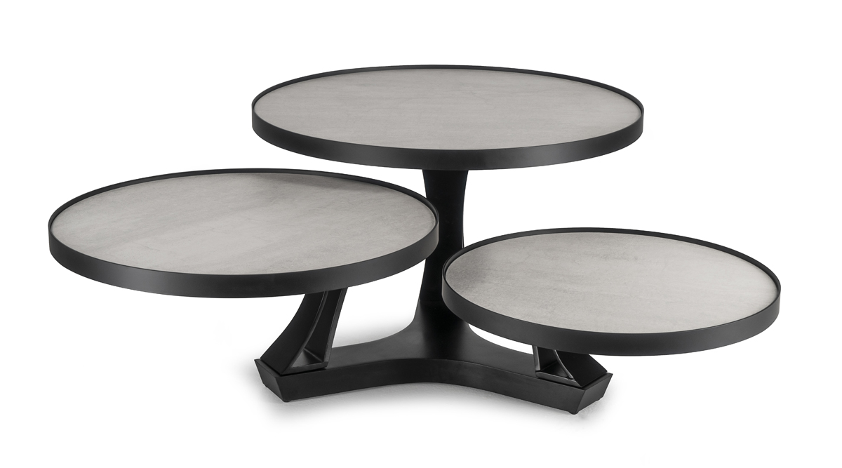 TAVOLINO ESTENSIBILE CON 3 PIANI IN CERAMICA. DOTATO DI UN INNOVATIVO MECCANISMO SINCRONIZZATO DI APERT URA CHE PERMETTE AI 3 CRISTALLI DI APRIRSI CON UN SOLO GESTO. SUPPORTI IN ACCIAIO VERNICIATO.