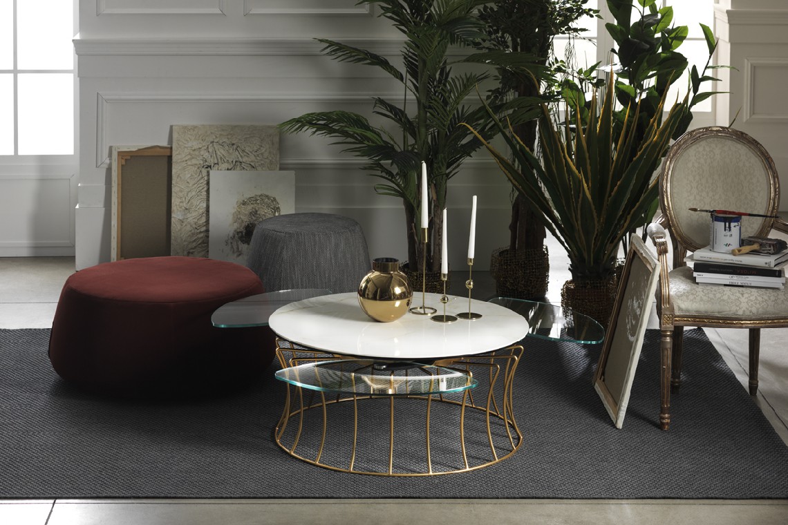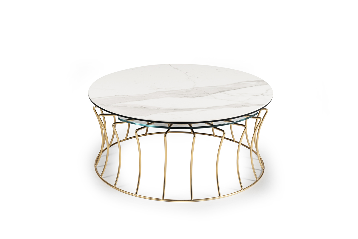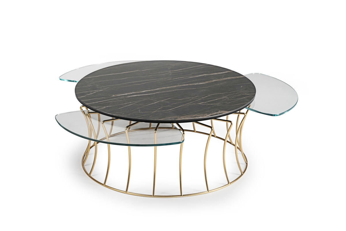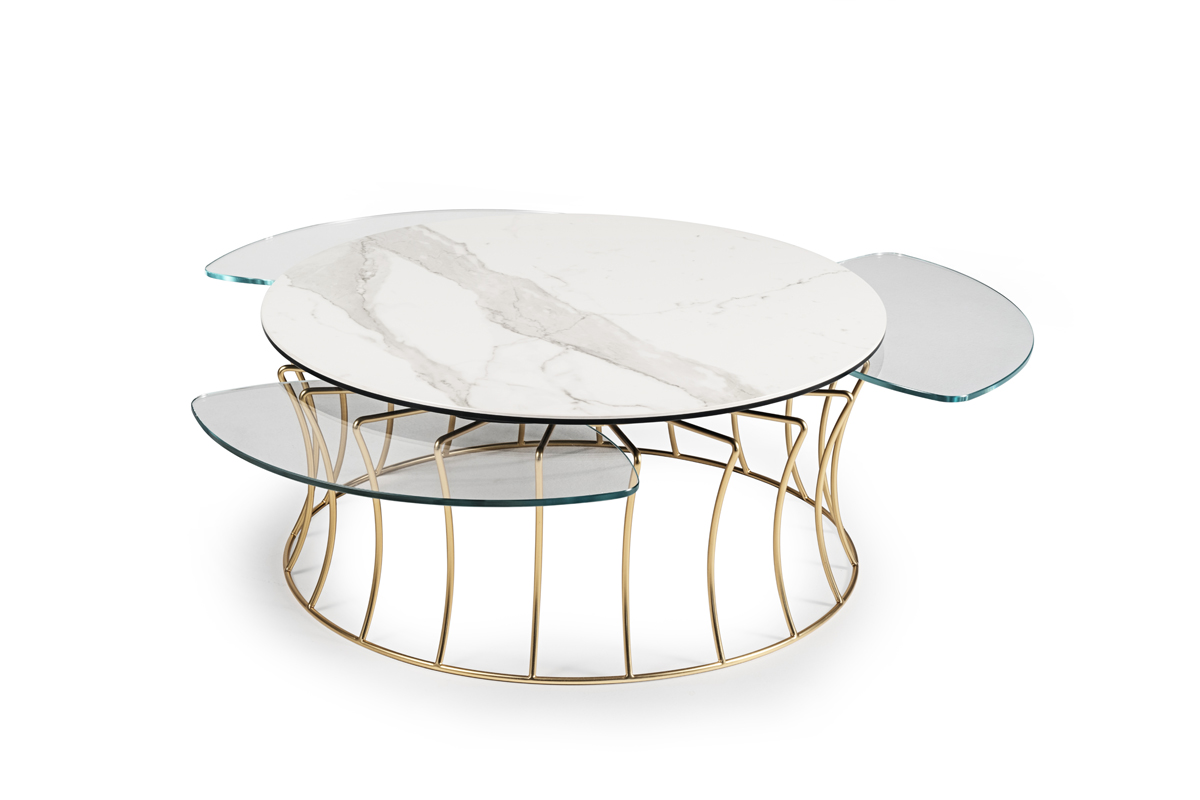 TAVOLINO ESTENSIBILE CON PIANI IN CERAMICA E CRISTALLO, BASE IN ACCIAIO VERNICIATO O GALVANIZZATO. DOTATO DI UN INNOVATIVO MECCANISMO CHE, ATTRAVERSO LA SOLA ROTAZIONE DEL PIANO SUPERIORE, PERMETTE AI TRE PIANETTI SOTTOSTANTI DI APRIRSI. DISPONIBILE ANCHE SENZA MECCANISMO.