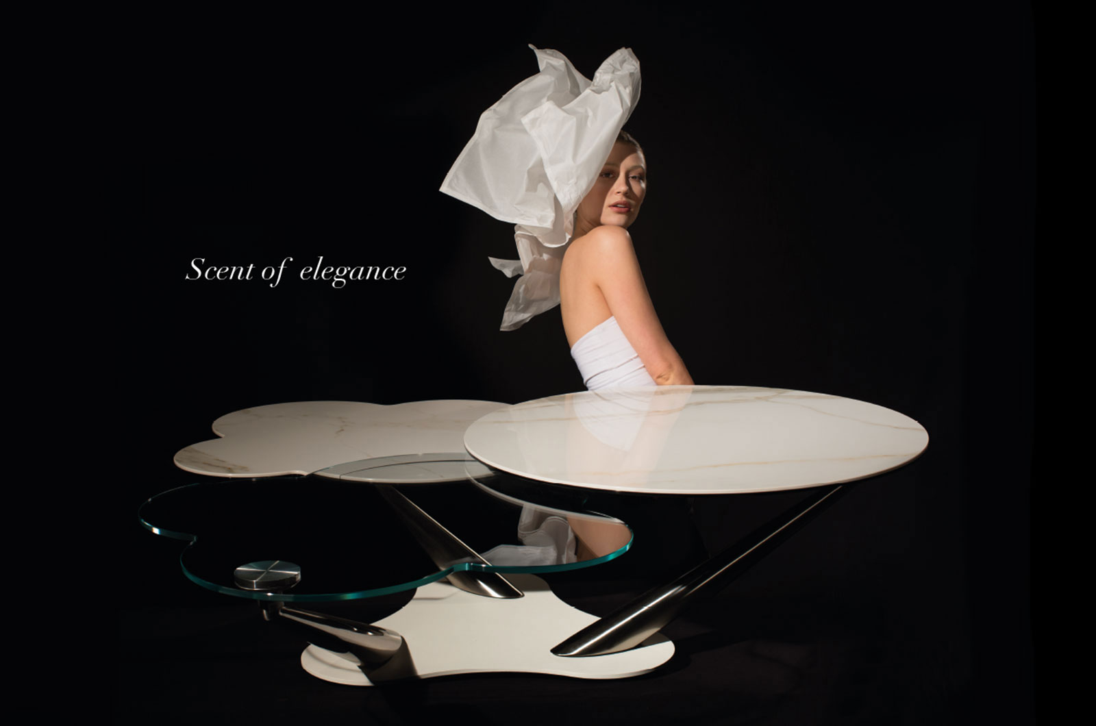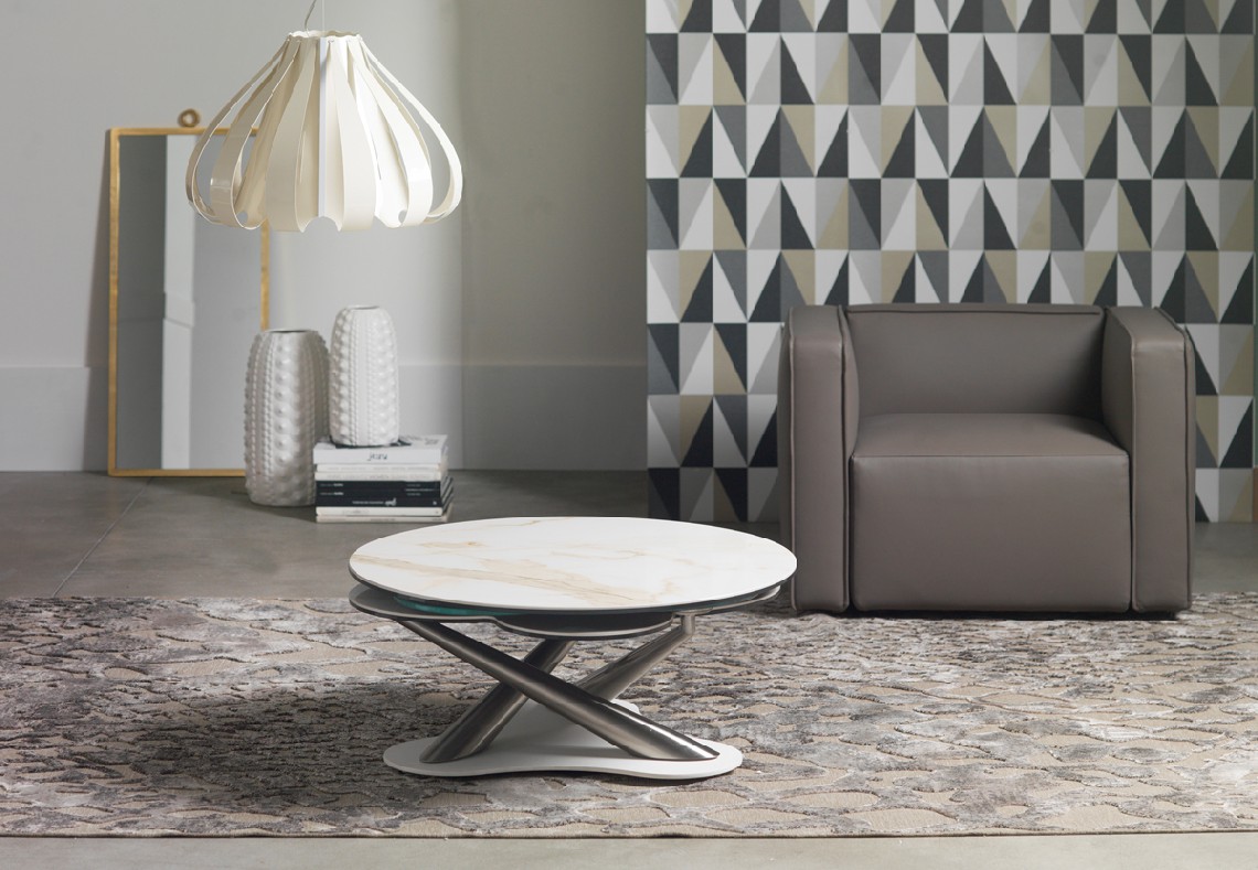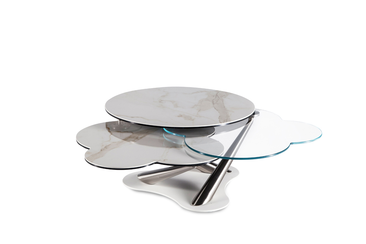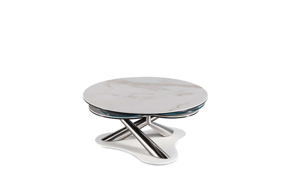 TAVOLINO ESTENSIBILE CON 3 PIANI GIREVOLISINCRONIZZATI IN CRISTALLO O CERAMICA. LA PARTICOLARE GEOMETRIA DEI PIANI E DEL MECCANISMO PERMETTE AL TAVOLO IN POSIZIONE CHIUSA DI NASCONDERE I PIANI SOTTOSTANTI. BASE E SUPPORTI IN ACCIAIO VERNICIATO OCROMATO.