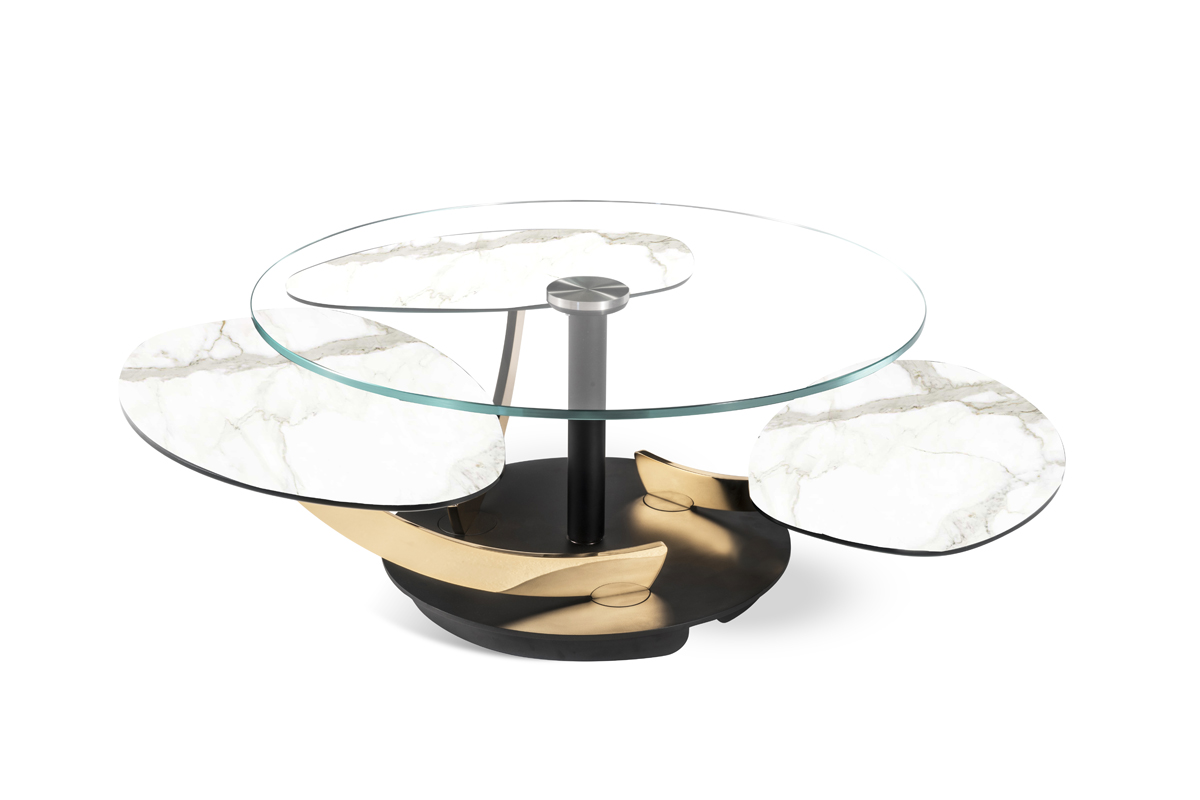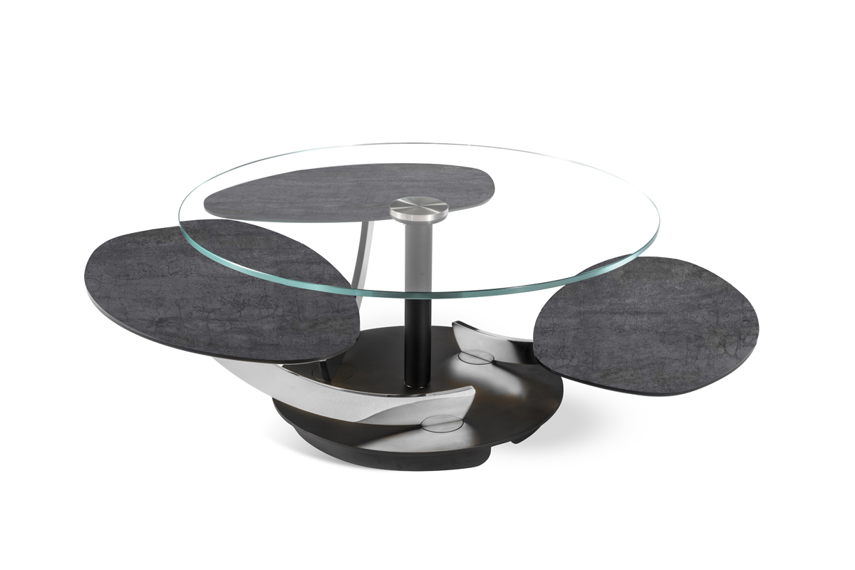 TAVOLINO ESTENSIBILE DOTATO DI UN INNOVATIVO MECCANISMO CHE, ATTRAVERSO LA SOLA ROTAZIONE DEL PIANO SUPERIORE, PERMETTE AI TRE PIANETTI SOTTOSTANTI DI APRIRSI. IN POSIZIONE CHIUSA IL PIANO SUPERIORE NASCONDE I PIANI SOTTOSTANTI