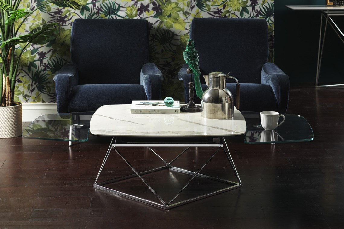 TAVOLINO ESTENSIBILE CON PIANI IN CERAMICA E CRISTALLO, BASE IN ACCIAIO VERNICIATO O GALVANIZZATO. DOTATO DI UN INNOVATIVO MECCANISMO CHE, ATTRAVERSO LA SOLA ROTAZIONE DEL PIANO SUPERIORE, PERMETTE AI DUE PIANETTI SOTTOSTANTI DI APRIRSI. DISPONIBILE ANCHE SENZA MECCANISMO.