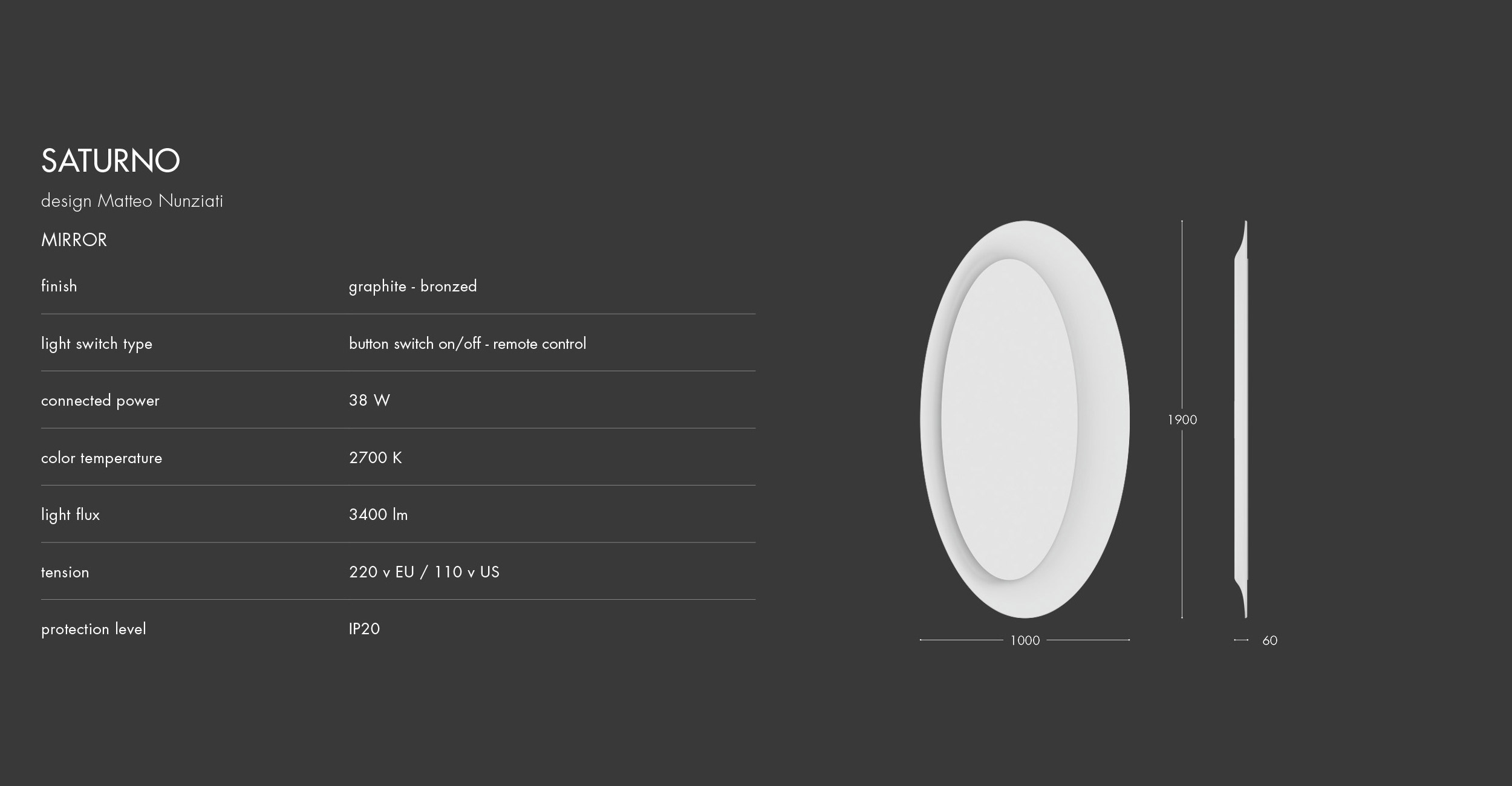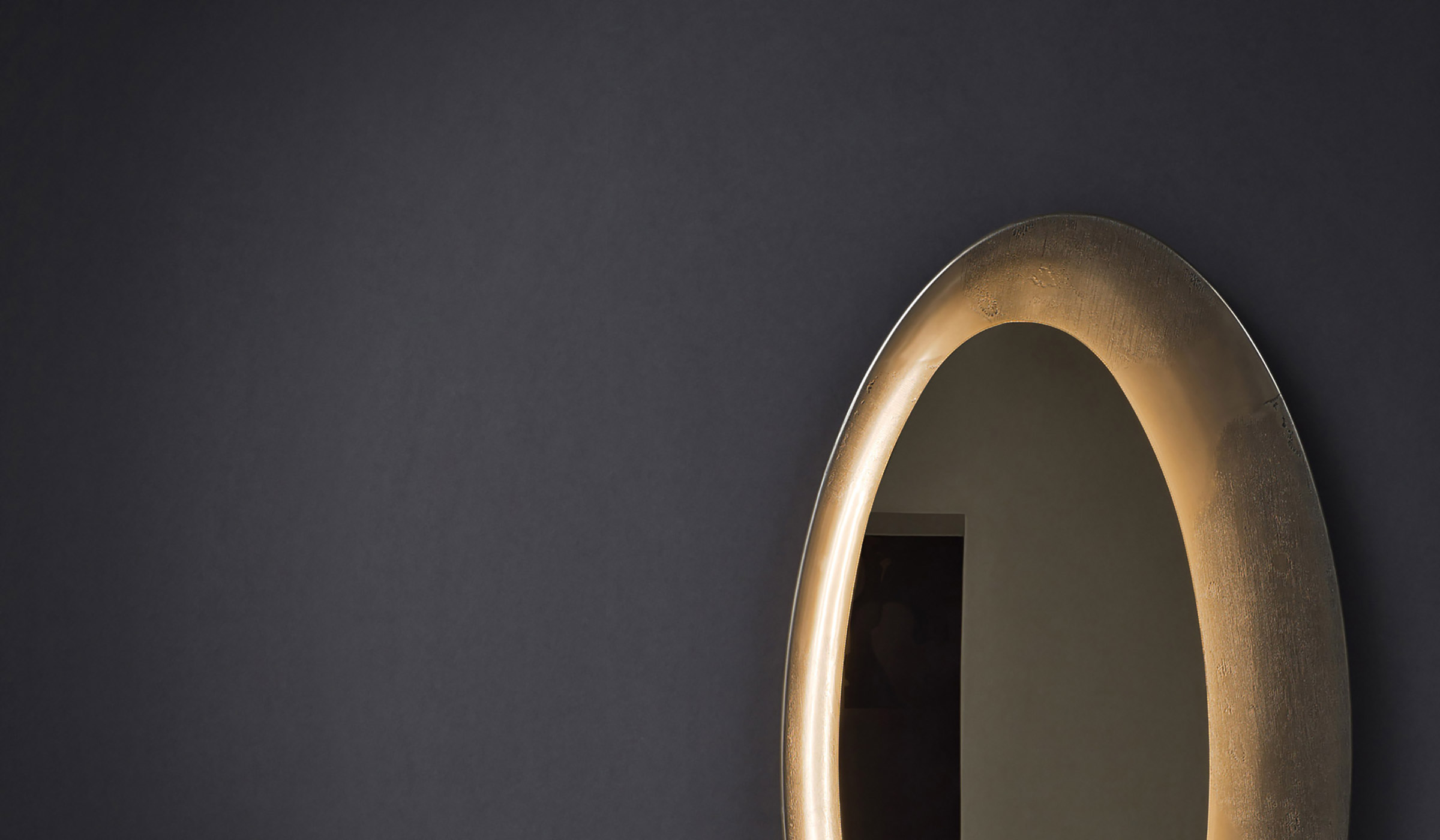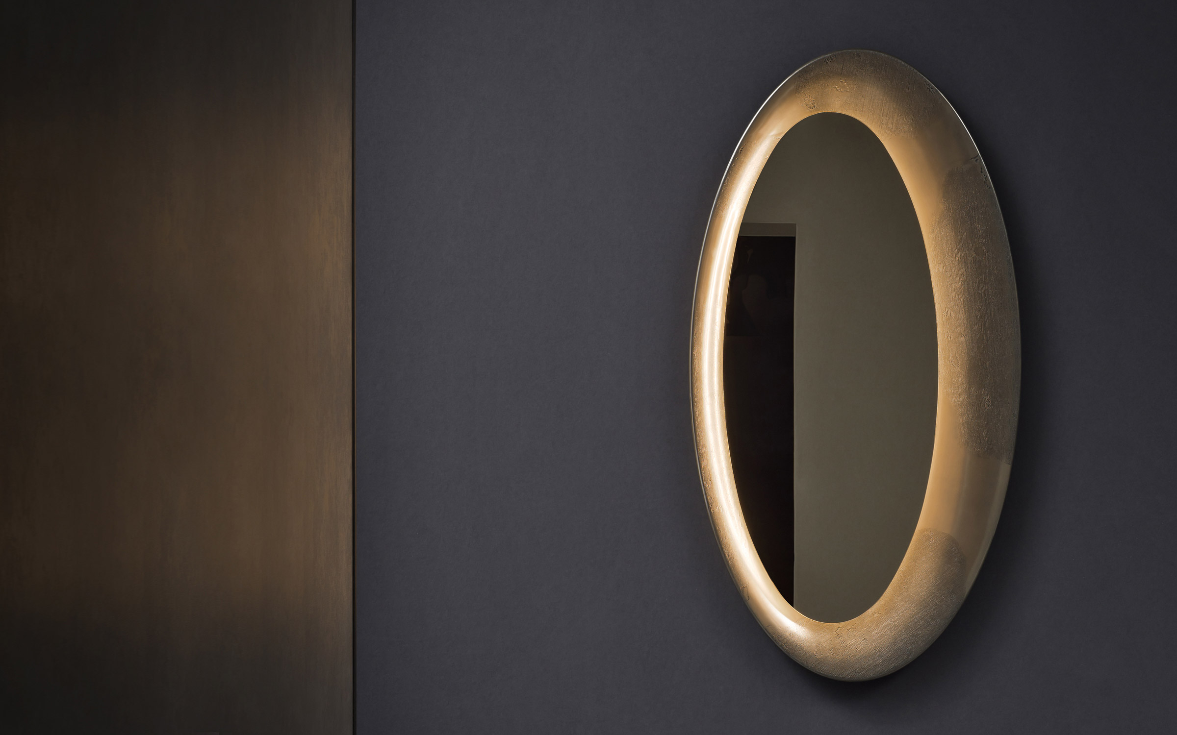 A majestic oval-shaped mirror, that can be positioned vertically of horizontally, is the ideal accessory to add prestige to large spaces, hotel lobbies and important mansions. The molded structure in Baydur? is available in two equally elegant versions graphite and bronze. Three types of glass are available for the mirror: natural, smoked, bronzed.
