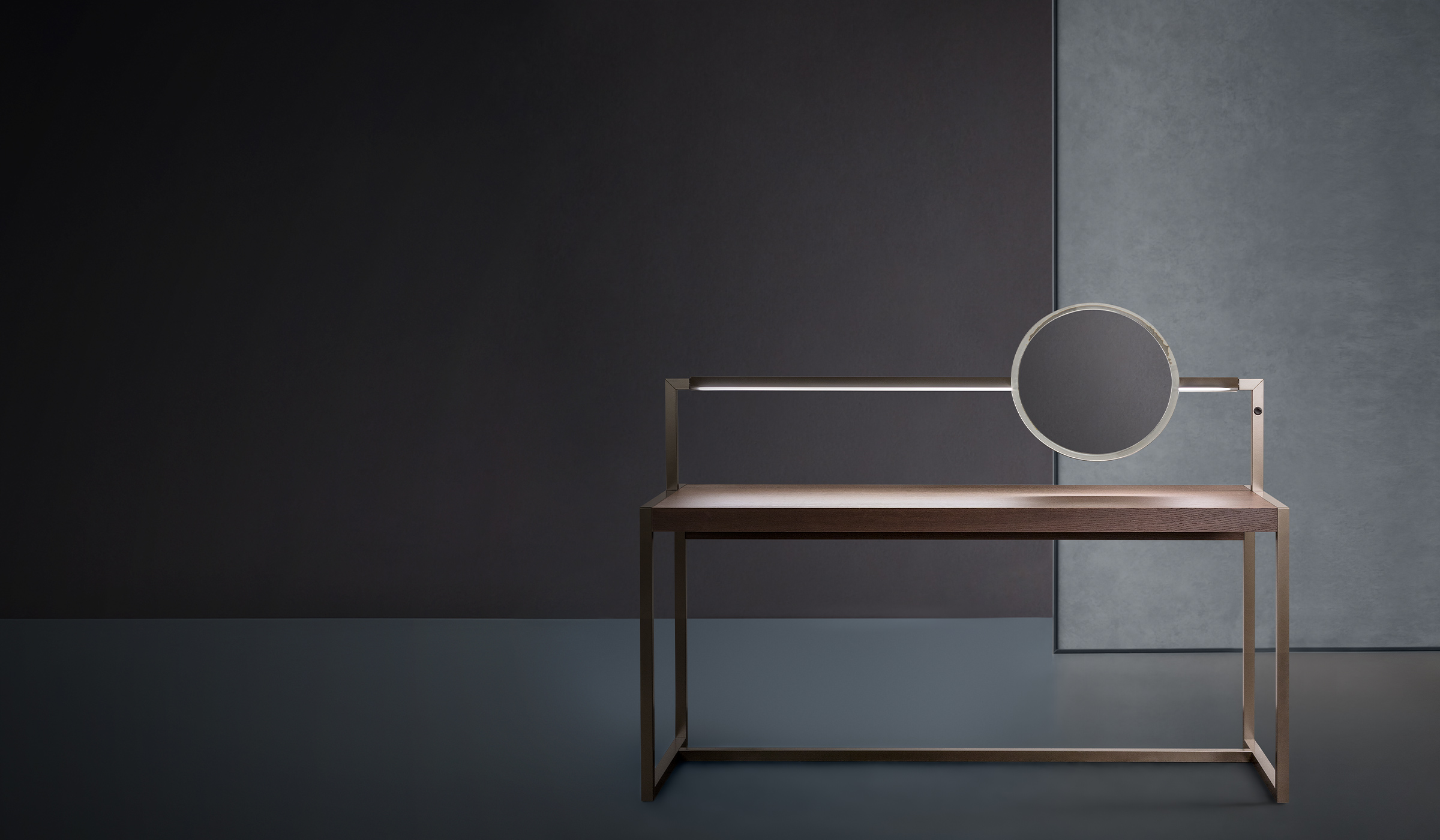 The LEDs are incorporated in the upper bar and these illuminate the worktop surface: adjusting its position modifies the diffusion of the light to suit requirements. The adjustable bar of the make-up vanity is fitted with a round mirror.