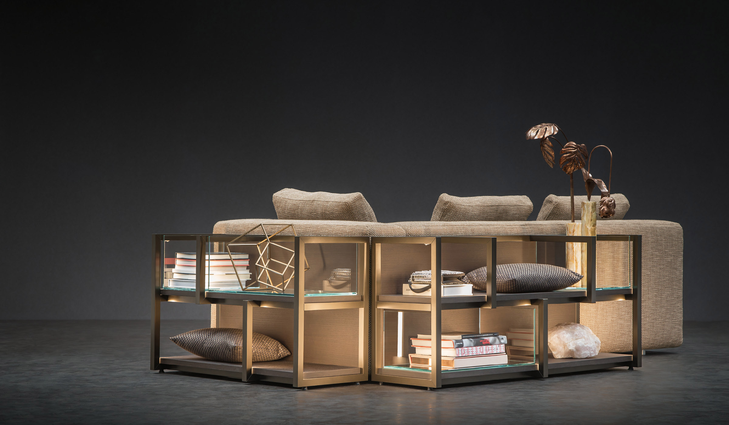 This small elegant book reiterates all of the characteristics of the Continuum system with one additional advantage: its limited height allows it to be positioned conveniently behind or beside sofas and armchairs. The LEDs are integrated in the uprights, guaranteeing perfect illumination for moments of conversation and reading. The shelves can be embellished with U-shaped extra-clear glass dividing units, available in two widths.