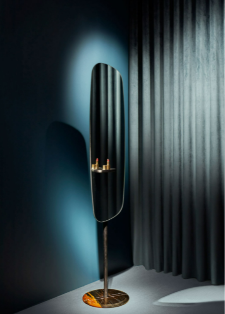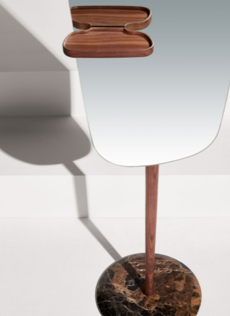 The singularity of this mirror is base don its caring proportions; a hand-made natural walnut shelf combines the softness lines of the mirror.