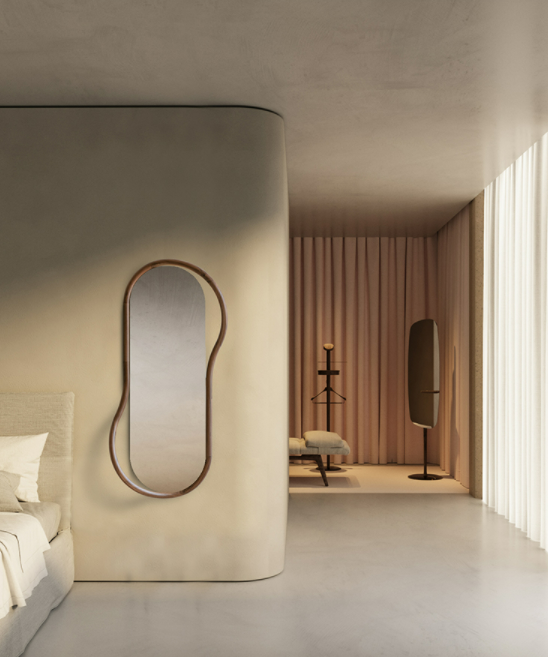 The singularity of this mirror is base don its caring proportions; a hand-made natural walnut shelf combines the softness lines of the mirror.