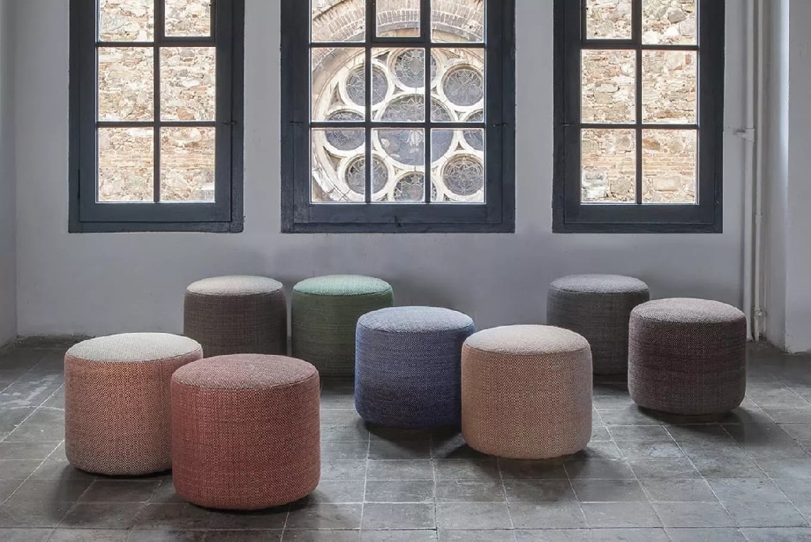 Its a cylindrical seating accessory is light, manageable, and comes in eight different variety of colors. Each rug combines with two poufs that are upholstered with the main color gradients.