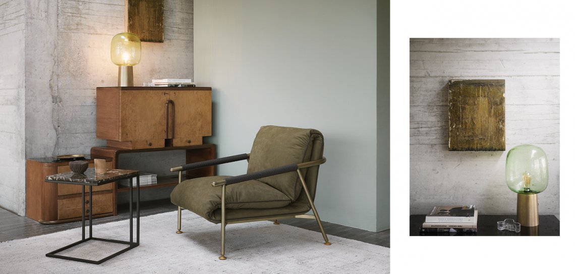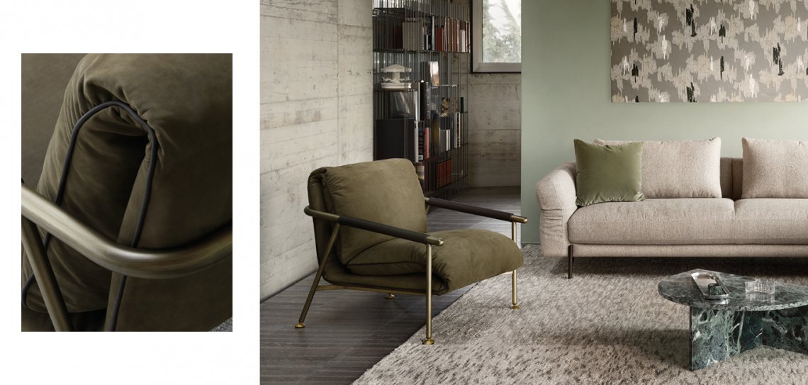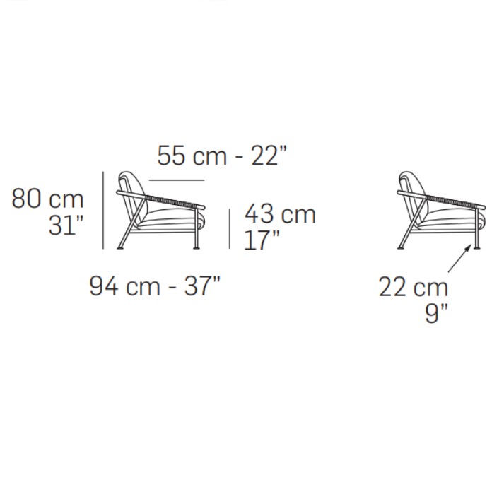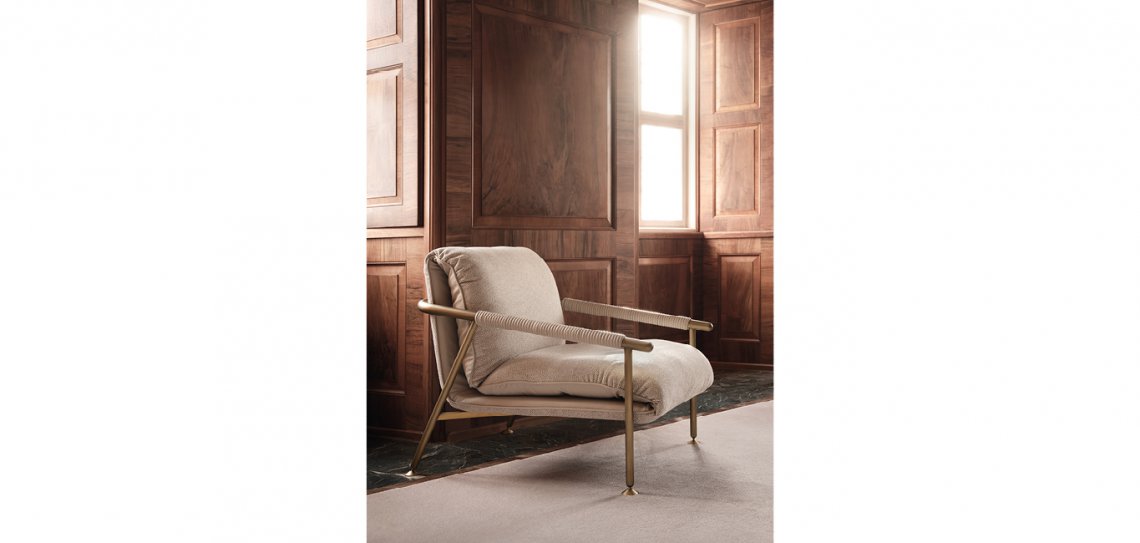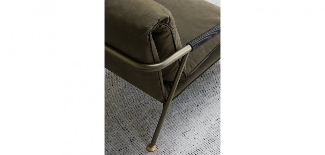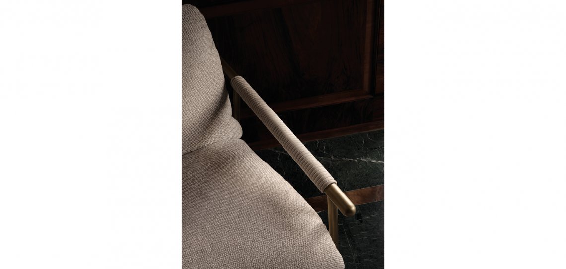 La sua linea snella, accentuata dalla leggerezza della struttura, è un perfetto esempio di moderna eleganza. I cuscini di seduta e schienale, piegati come petali, invitano a una posizione informale e rilassata. Braccioli rivestiti da un cordoncino in eco-pelle.