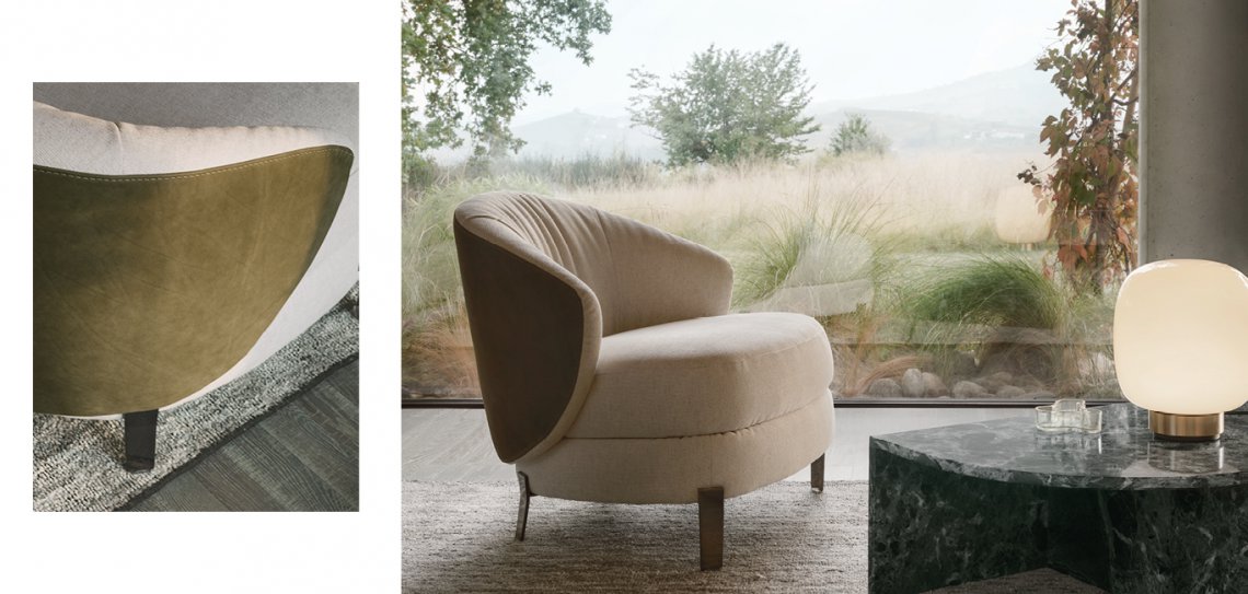 Il progetto lavora sull’idea del contrasto, enfatizzandolo, opponendo alla struttura rigida dell’elemento in tessuto o in pelle la morbidezza della parte imbottita, che si rivela anche sul retro, consentendo interessanti combinazioni cromatiche tra scocca esterna e cuscinatura interna.
