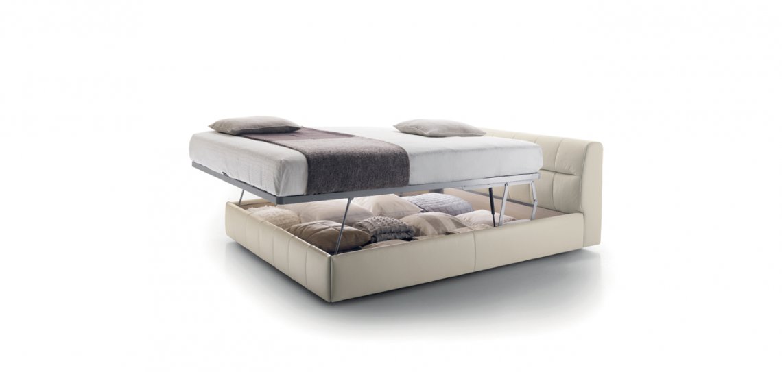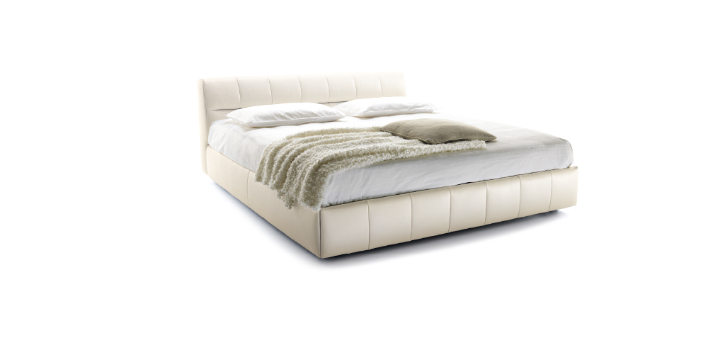 Linee verticali per segnare il giroletto imbottito. La testata, disponibile in due altezze, è caratterizzata invece dall’incrocio di queste linee con segni orizzontali di forte carattere. Intersecandosi formano una texture regolare dal design giovane e contemporaneo. La versione contenitore è disponibile con sistema di apertura rete “a un movimento” e “a due movimenti”.