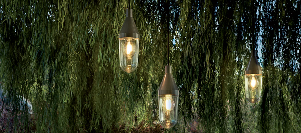 The light bulb is protected by a glass bell and both are fixed to a metal cone, available in several different versions according to the type of lamp: cable-suspended in the indoor suspended version, fastened to a metal bracket in the indoor/outdoor wall version – and with a free line cable in the outdoor version, where Niwa reveals a nomadic soul, lending itself to a wide range of applications, coiled around a tree branch or resting, free, on a green English lawn.