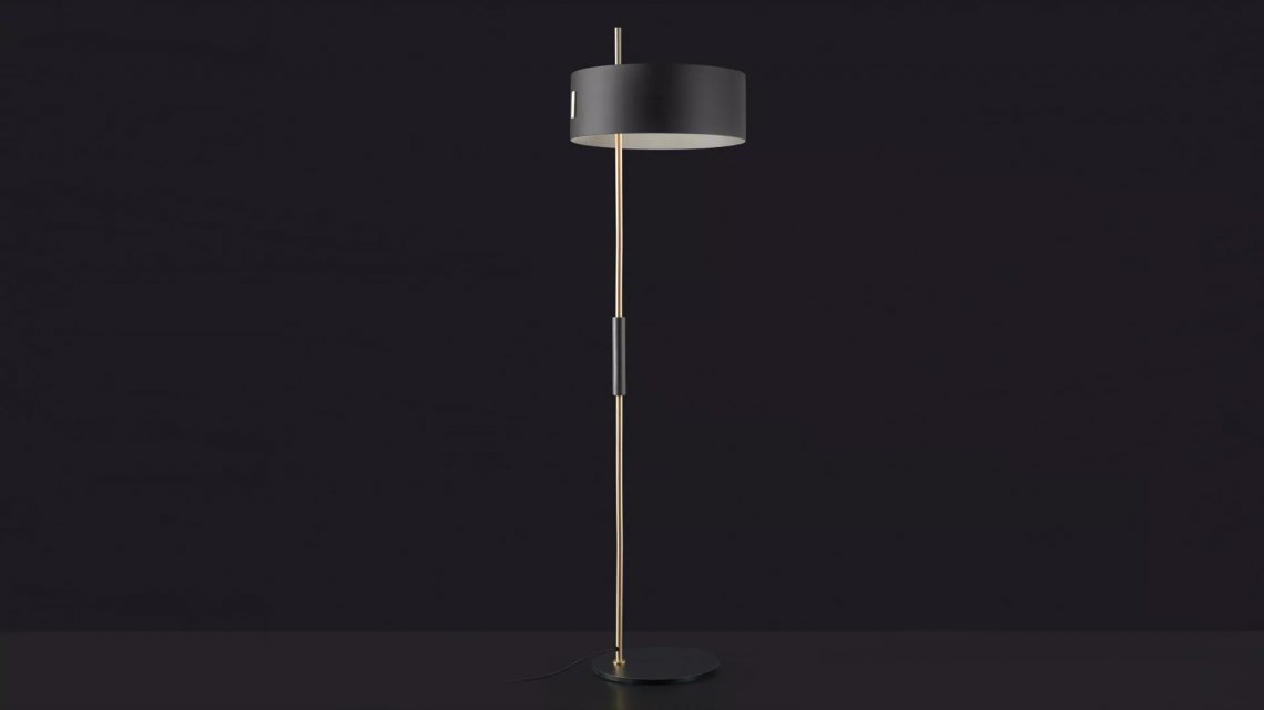 The lamp 1953 designed, by Ostuni e Forti, has two models, floor and table, varying in proportion and size but identical in their design which shifts the whole lampshade section from the centre to the side. A range that elegantly recalls the style of those years, such as the use of a shade in the classic cylindrical shape and the fine contrast of the satin gold – stem and shade’s interior – against the black – the exterior of the shade, the base and the stem grip.