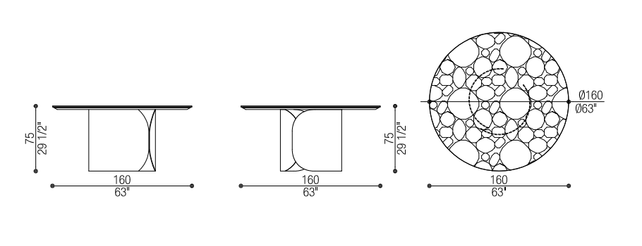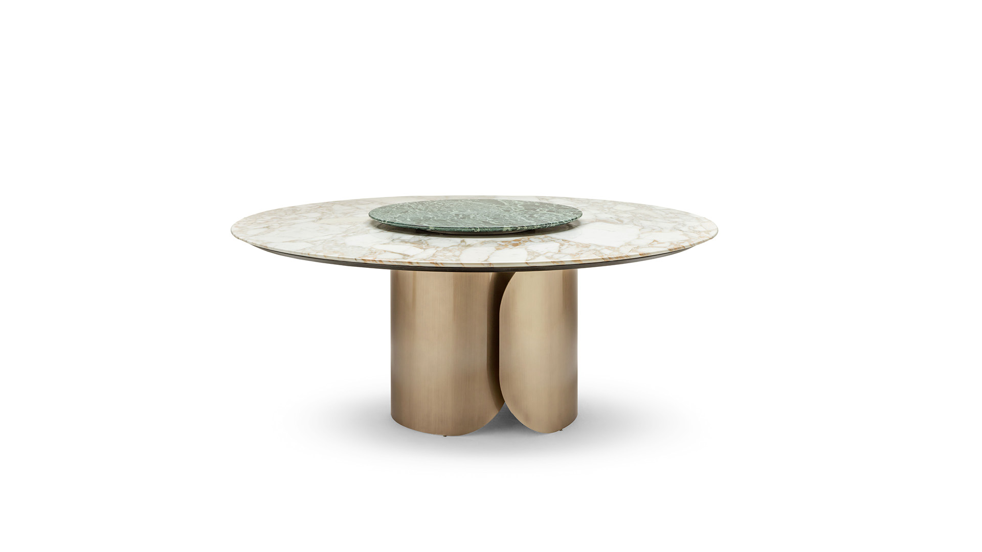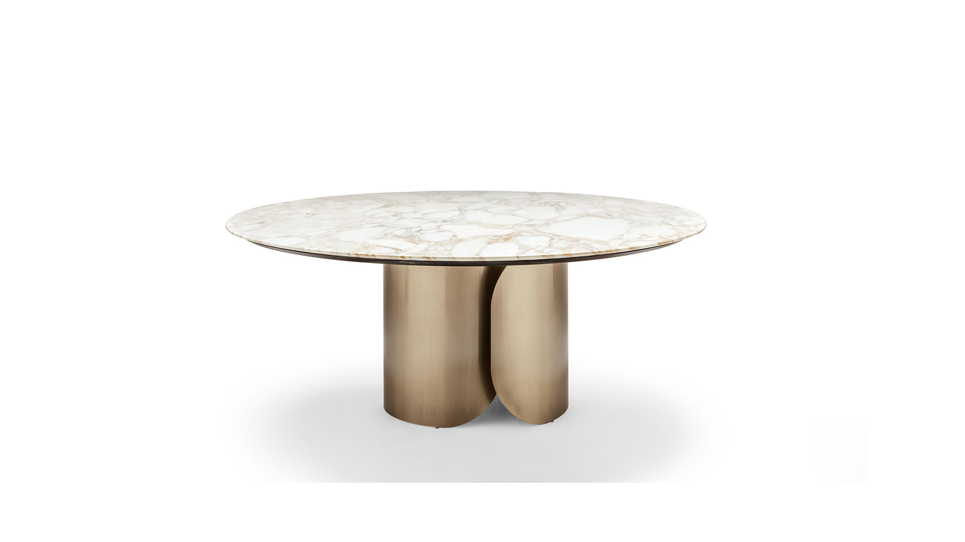Il tavolo rotondo con base metallo Oscar è caratterizzato da un vivace contrasto materico tra la base e il piano in marmo. La struttura cilindrica arrotondata si apre su un lato per mostrare l’interno cavo.