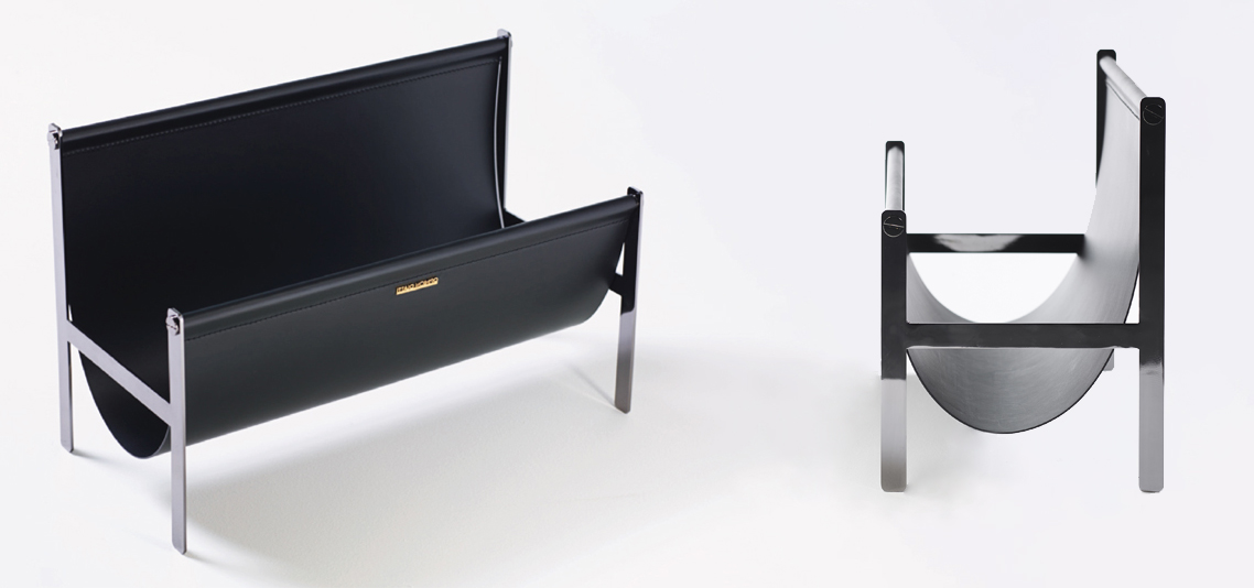 Portariviste, un oggetto così identitario da non aver bisogno di un nome diverso per definirlo. Portariviste tanto simile nel concetto quanto distante nella sostanza, dalla linea degli essenziali di Lapo Ciatti. Arredi - ILtavolo, LAlampada, ILletto, LApanca – e accessori Fermaporte e Portariviste appunto, tutti ugualmente caratterizzati dall’estrema riconoscibilità delle forme e dalla funzionalità pura, per i quali le presentazioni, se non inutili, appaiono quantomeno superflue. Portariviste è un oggetto dalla grande personalità, realizzato in cuoio, rigenerato nero o naturale, e struttura in acciaio lucido – nichel nero o oro 24 k – è perfetto in ogni stanza dove ci sia la necessità di mettere ordine con grinta e carattere. A casa, in un ufficio, nella lounge di un prestigioso albergo o nell’angolo lettura di un sofisticato bar.