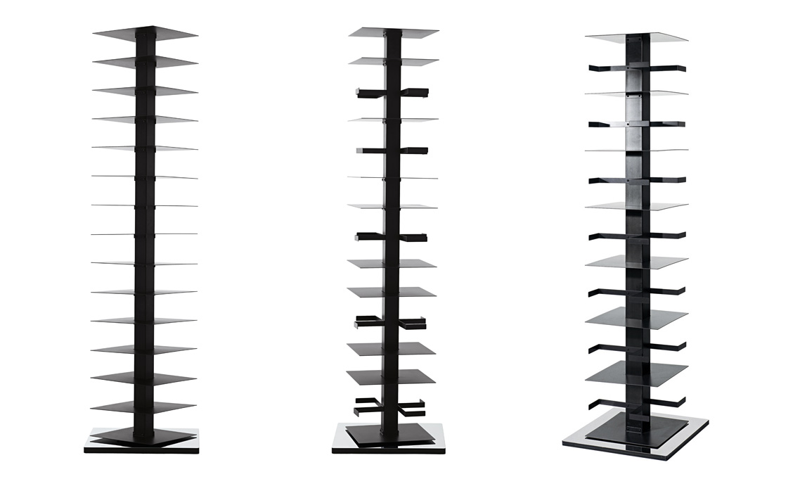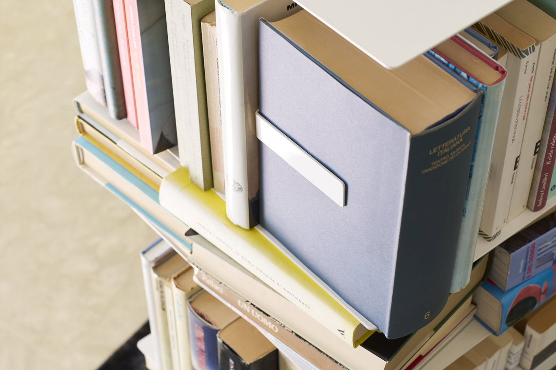Ptolomeo X4 è la versione a 4 lati e girevole a 360° di Original Ptolomeo, il complemento d'arredo perfetto per gli amanti dei libri, dell'ordine e del design d'autore. La libreria si sviluppa attorno ad una colonna centrale da cui partono ripiani quadrati, dai 3 ai 14 a seconda dell’altezza e della tipologia. La sua linea slanciata non passa inosservata e il suo design, partendo da un concetto semplice, offre agli spazi in cui viene posizionata uno stile impeccabile e difficile da dimenticare. Non ingombrante, disponibile in 2 altezze (110 o 197 cm) e declinabile in 3 varianti di sistemazione interna, puo’ contenere libri disposti sia in orizzontale che in verticale creando un suggestivo effetto patchwork. Self standing si presenta con un look longilineo ed asciutto, denso di un'eleganza contemporanea che valorizza con la sua presenza anche le stanze dall'arredo piu' minimalista. In salotto, accanto alla poltrona, in un angolo della camera da letto o a fianco della scrivania nello studio professionale, arricchisce di stile ogni zona della casa e dell'ufficio, garantendo nonostante la sua elevatissima capacità contenitiva (fino a 420 libri nella versione più alta a 14 mensole) grandissima stabilità. Realizzata in metallo Ptolomeo x4 puo’ essere lucida se laccata di un candido bianco o nera opaca con la base in acciaio inox lucido.