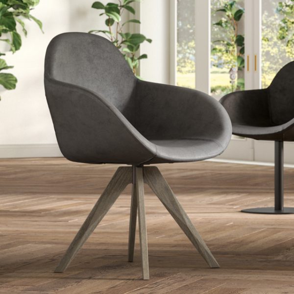 Poltroncina con basamento in faggio e seduta rivestita in velvet, eco pelle nabuk o pelle.