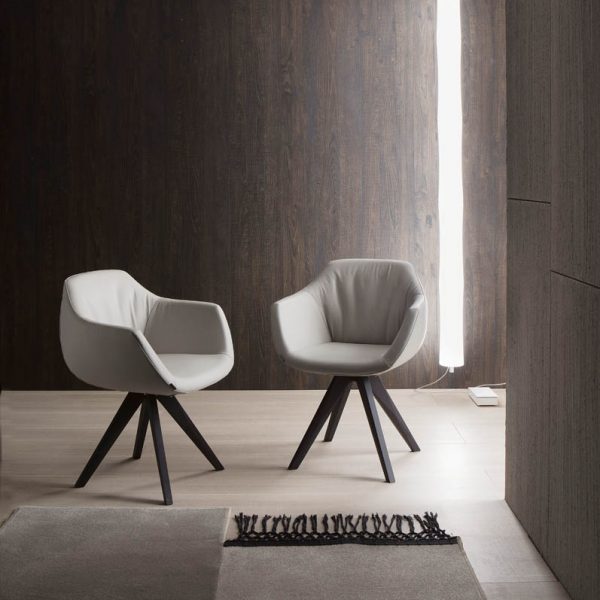 Poltroncina con basamento in faggio e morbida seduta rivestita in pelle, eco pelle nabuk o velvet.