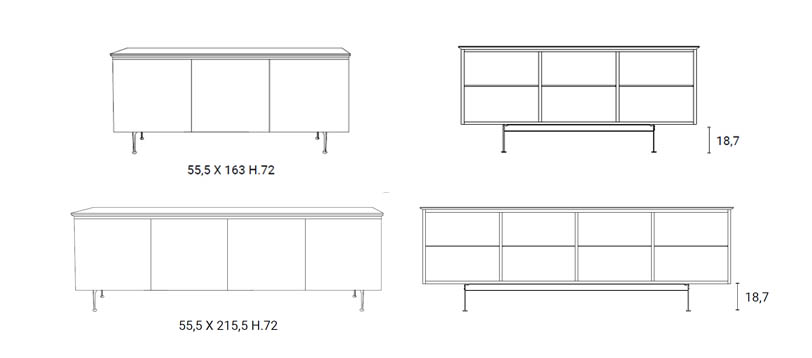 Madia con contenitore laccato. Ante e piano rivestiti in essenza. Ripiani trasparenti e piedini in metallo verniciato.
