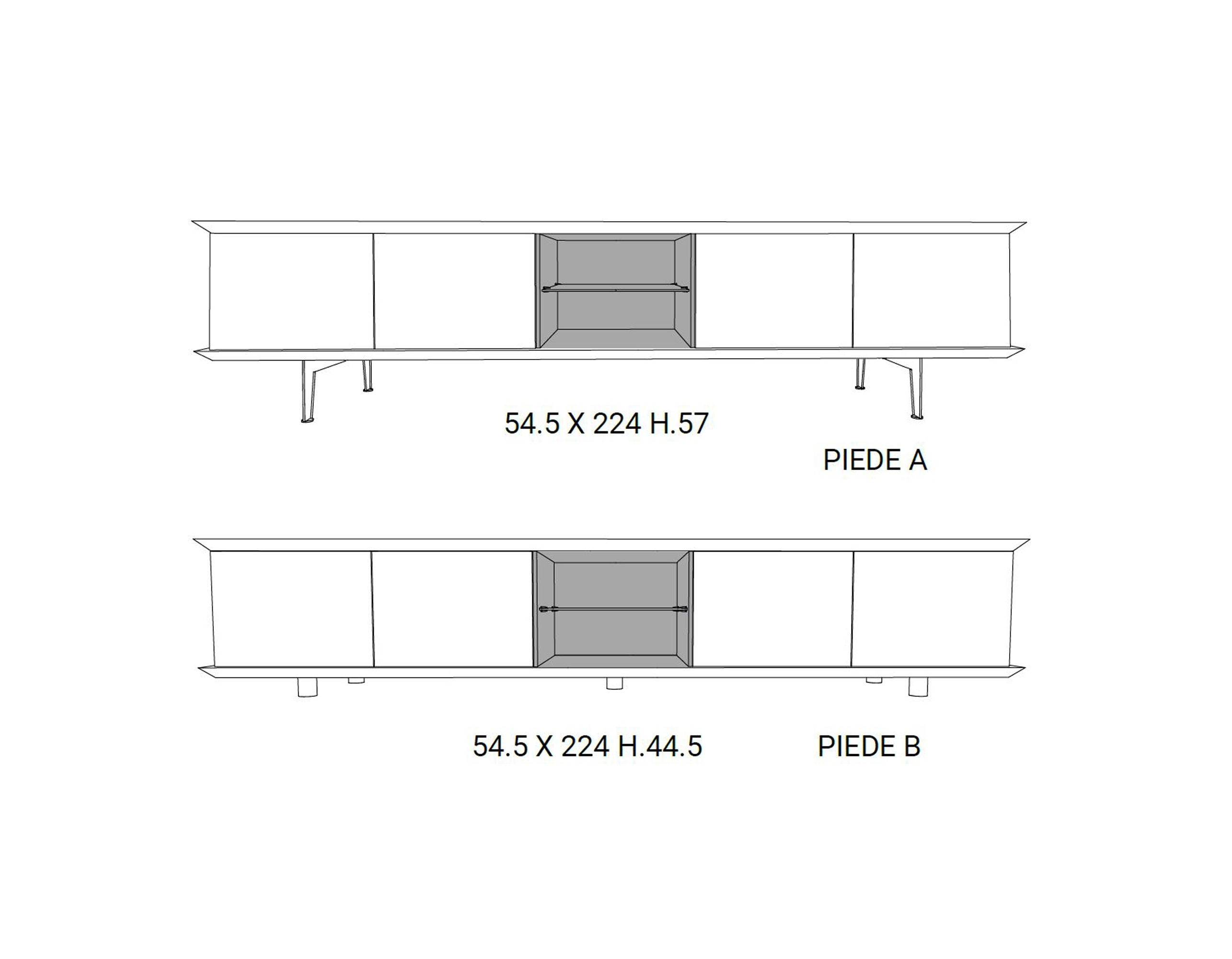 Madia con contenitore laccato, ante e fianchi in essenza o laccato. Ripiani interni in cristallo e anta in vetro fumè.