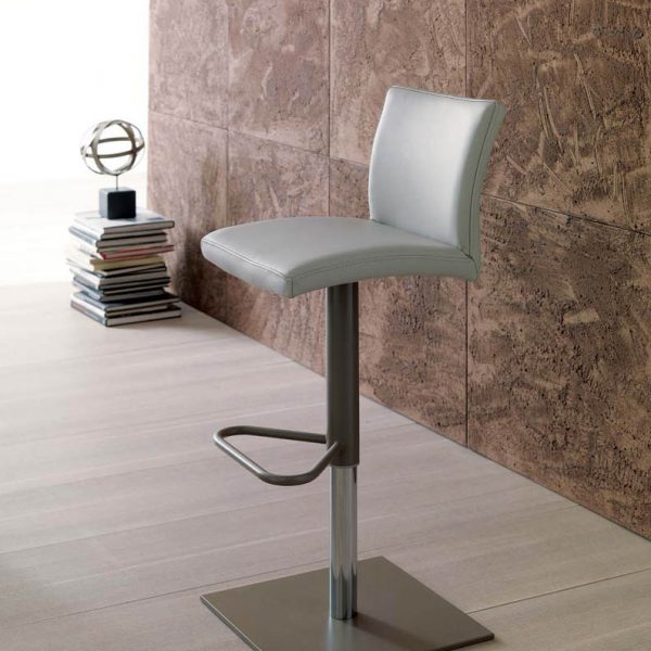 Sgabello con alzata a gas, basamento in metallo e seduta rivestita in pelle o eco pelle nabuk.
