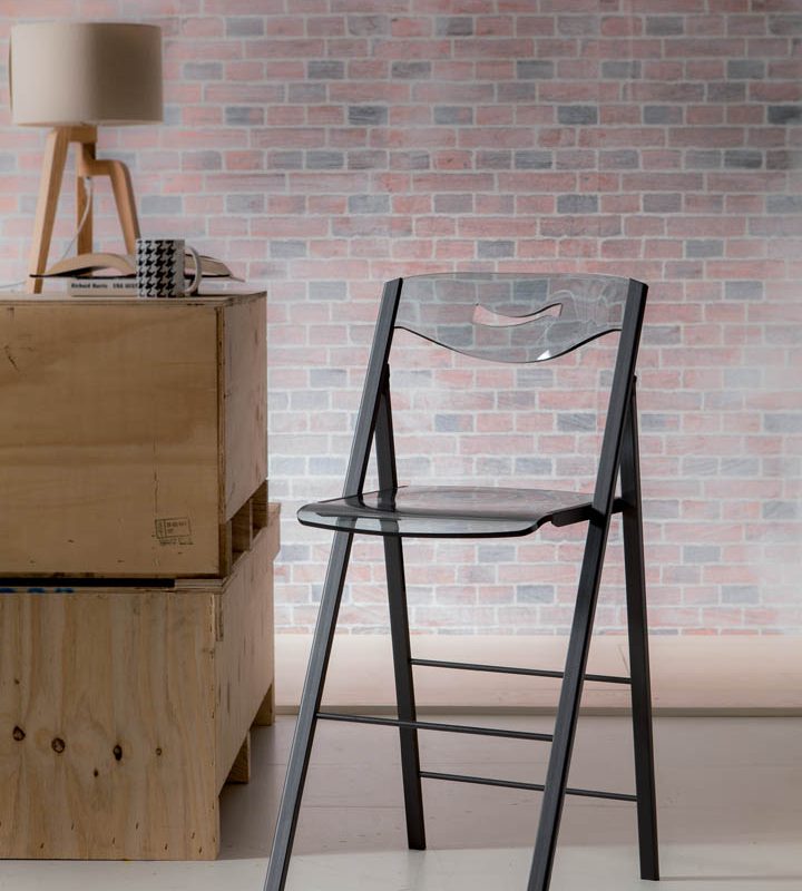 Sgabello pieghevole con struttura in metallo, seduta e schienale in vitrex, legno o lamiera forata