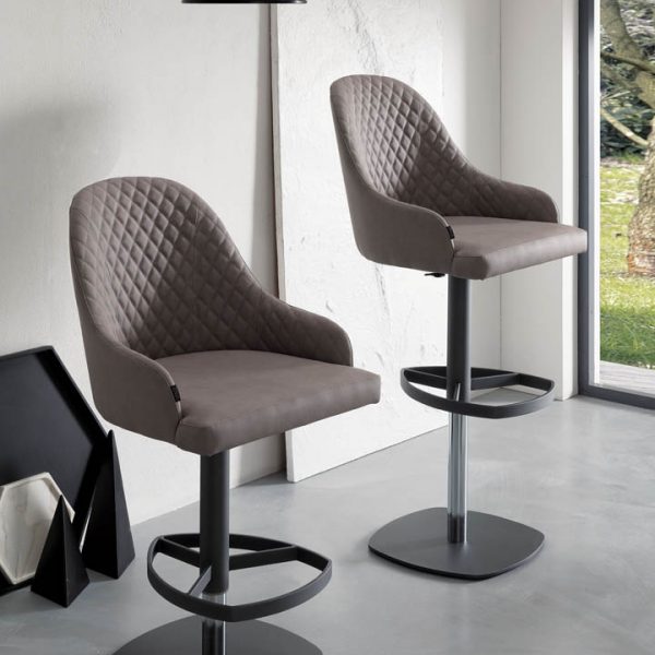 Sgabello con alzata a gas, basamento in metallo e seduta rivestita in pelle, velvet o eco pelle nabuk con interno trapuntato.