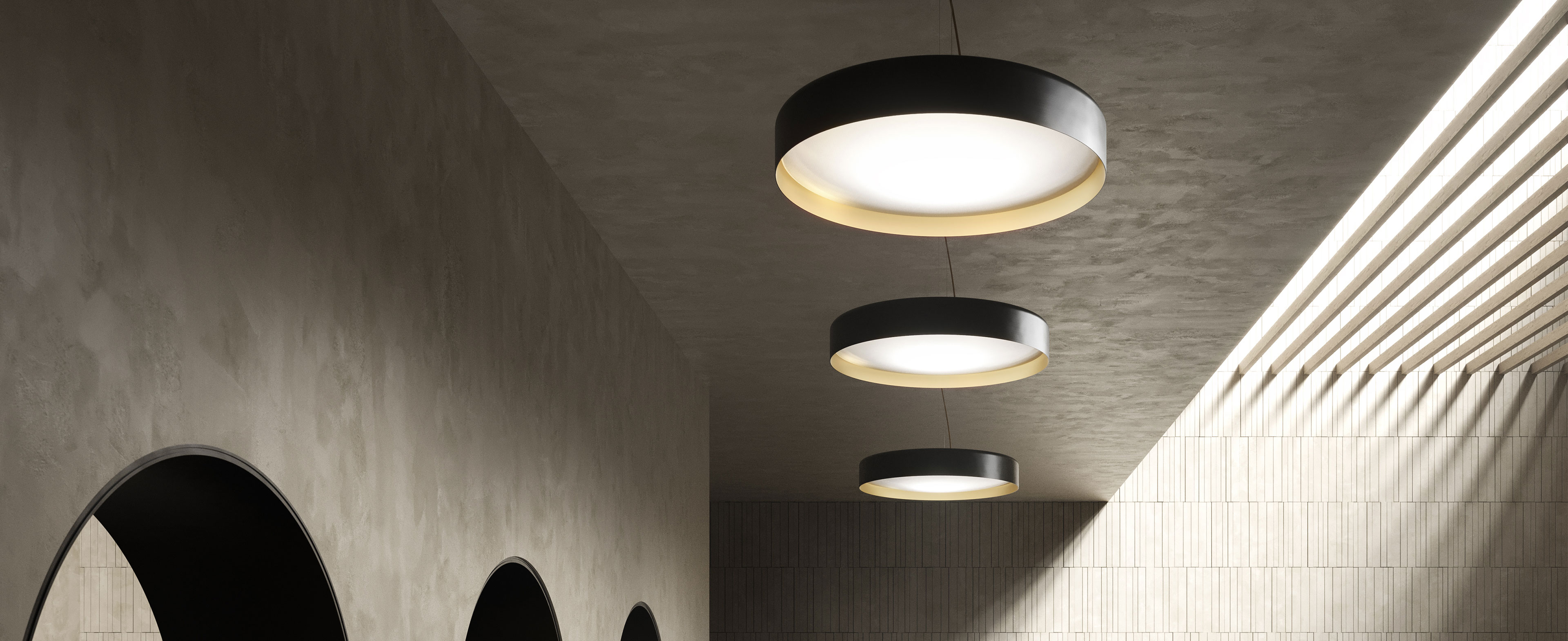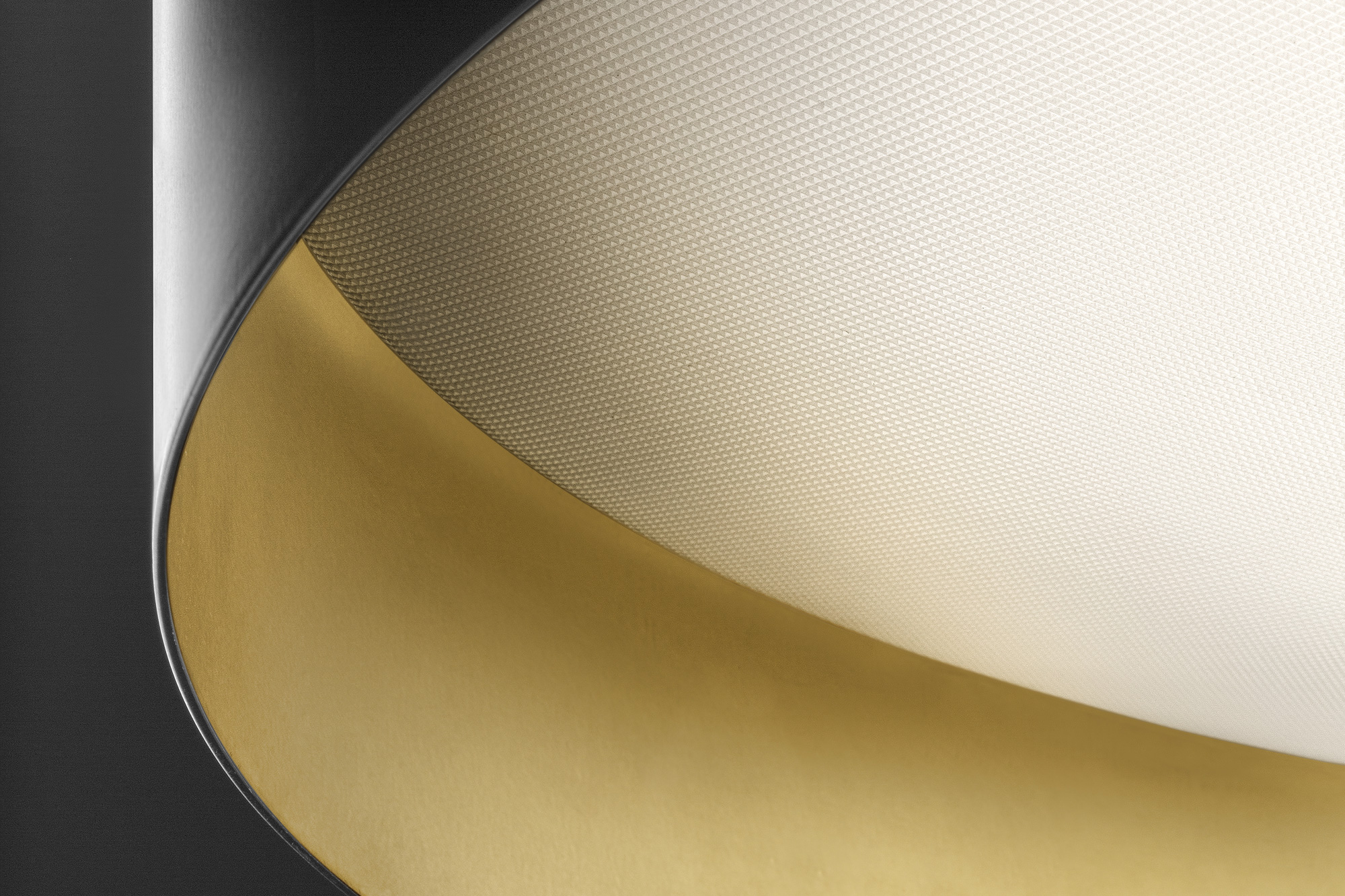 Lampada a sospensione e soffitto con diffusore microprismato a luminanza controllata. Versione a soffitto con emissione diretta attraverso modulo LED disponibile anche tunable white. La versione sospensione combina emissione diretta e indiretta dimmerabili. Corpo lampada in alluminio tornito rifinito con vernice poliacrilica nelle versioni esterno nero e interno oro o esterno bianco e interno oro. Possibili colori custom su richiesta. Ideale per hall, zone living, grandi spazi, e uffici.