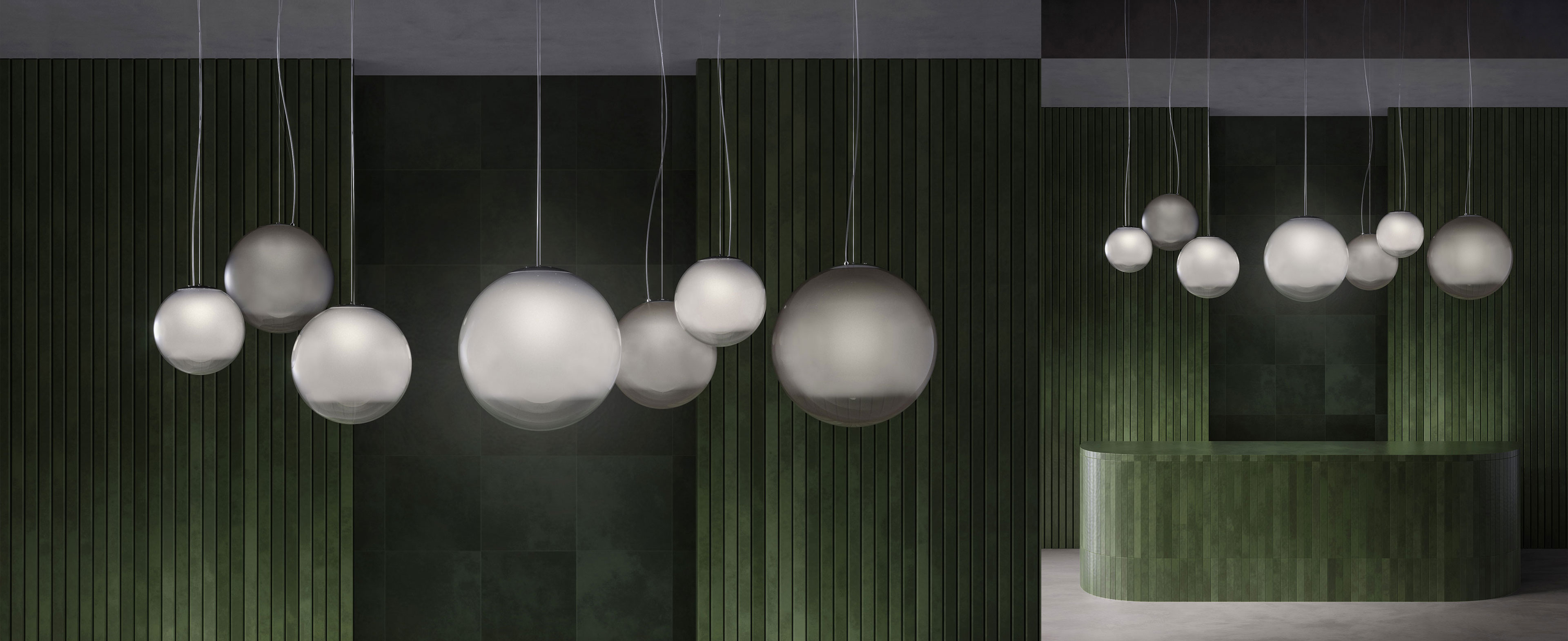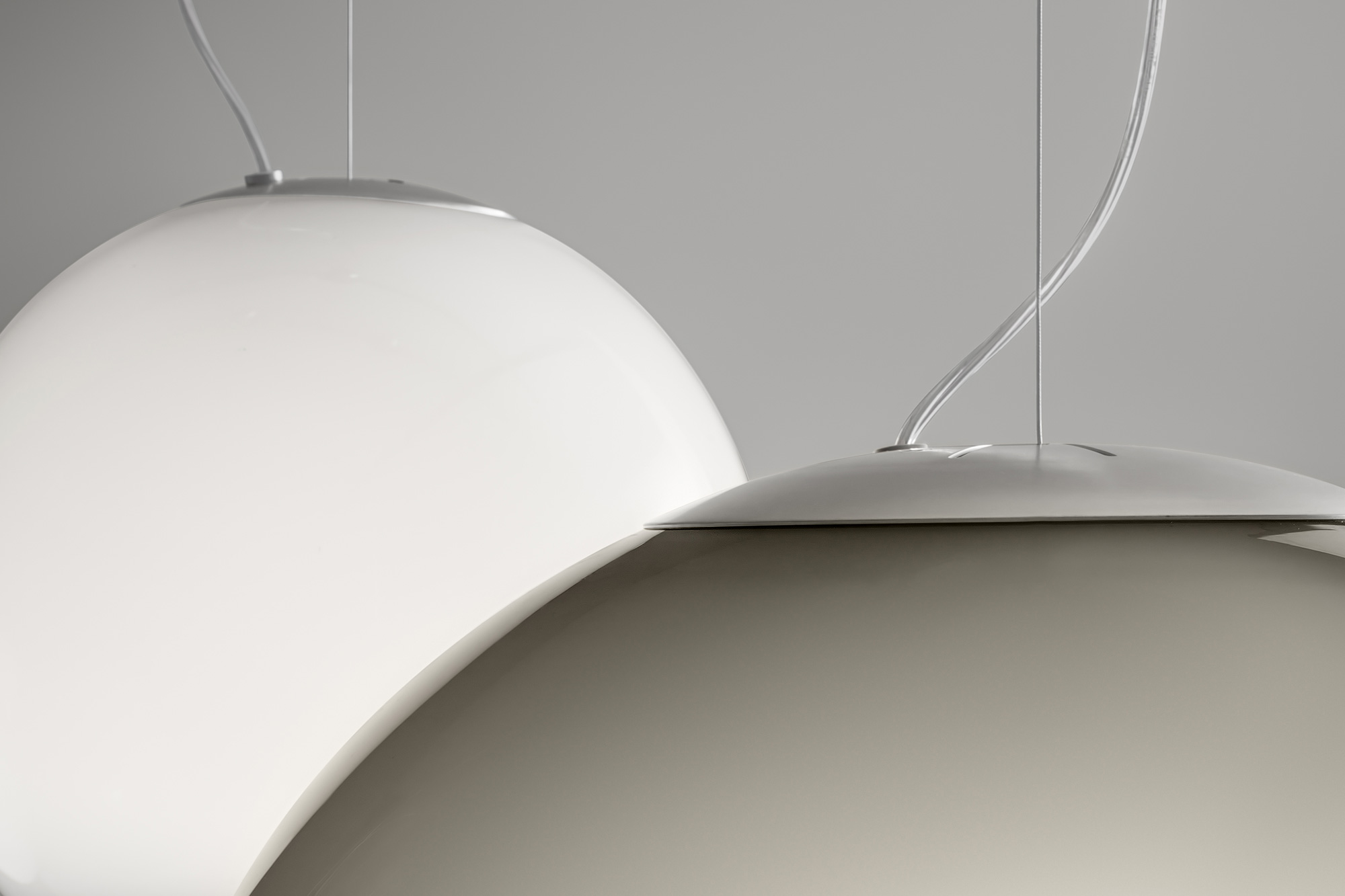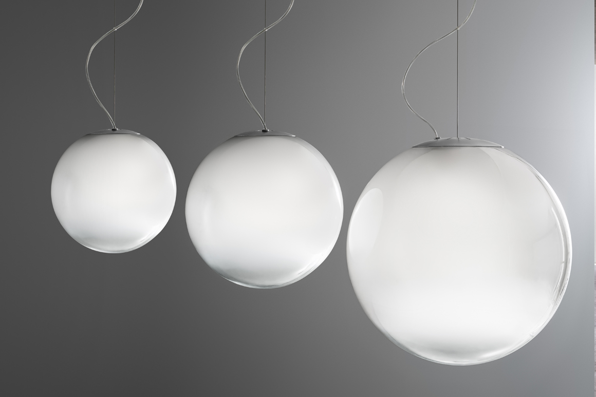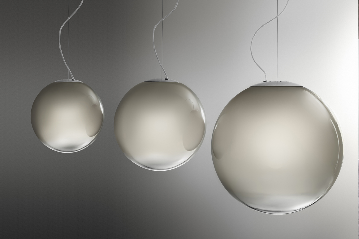 Lampada a sospensione in vetro soffiato lavorato a mano con effetto sfumato. Rosone in metallo spazzolato e verniciato colore titanio. Emissione di luce diffusa con attacco E27, lampadina LED dimmerabile inclusa. Vetro soffiato disponibile in tre misure, in colore bianco sfumato o fumè sfumato. Cavo elettrico trasparente.