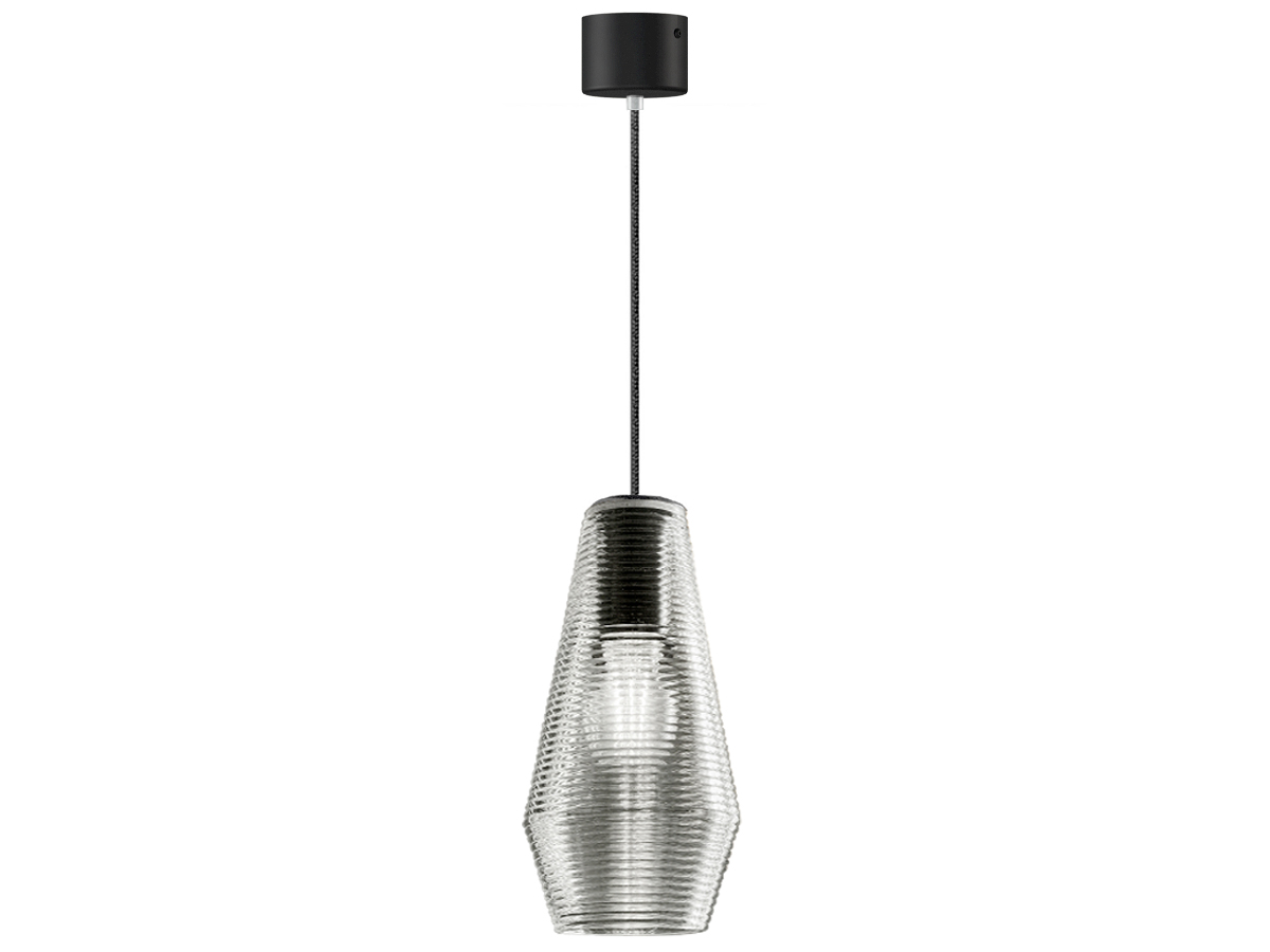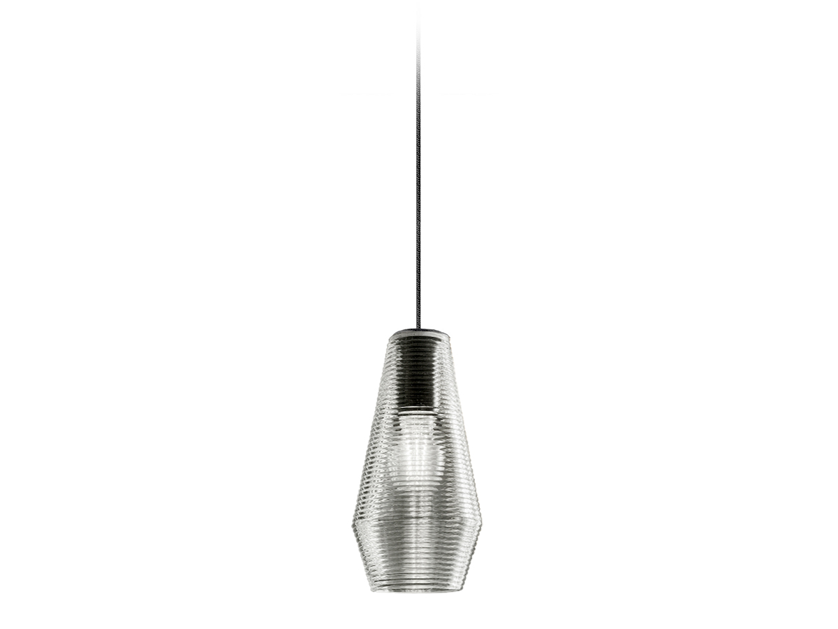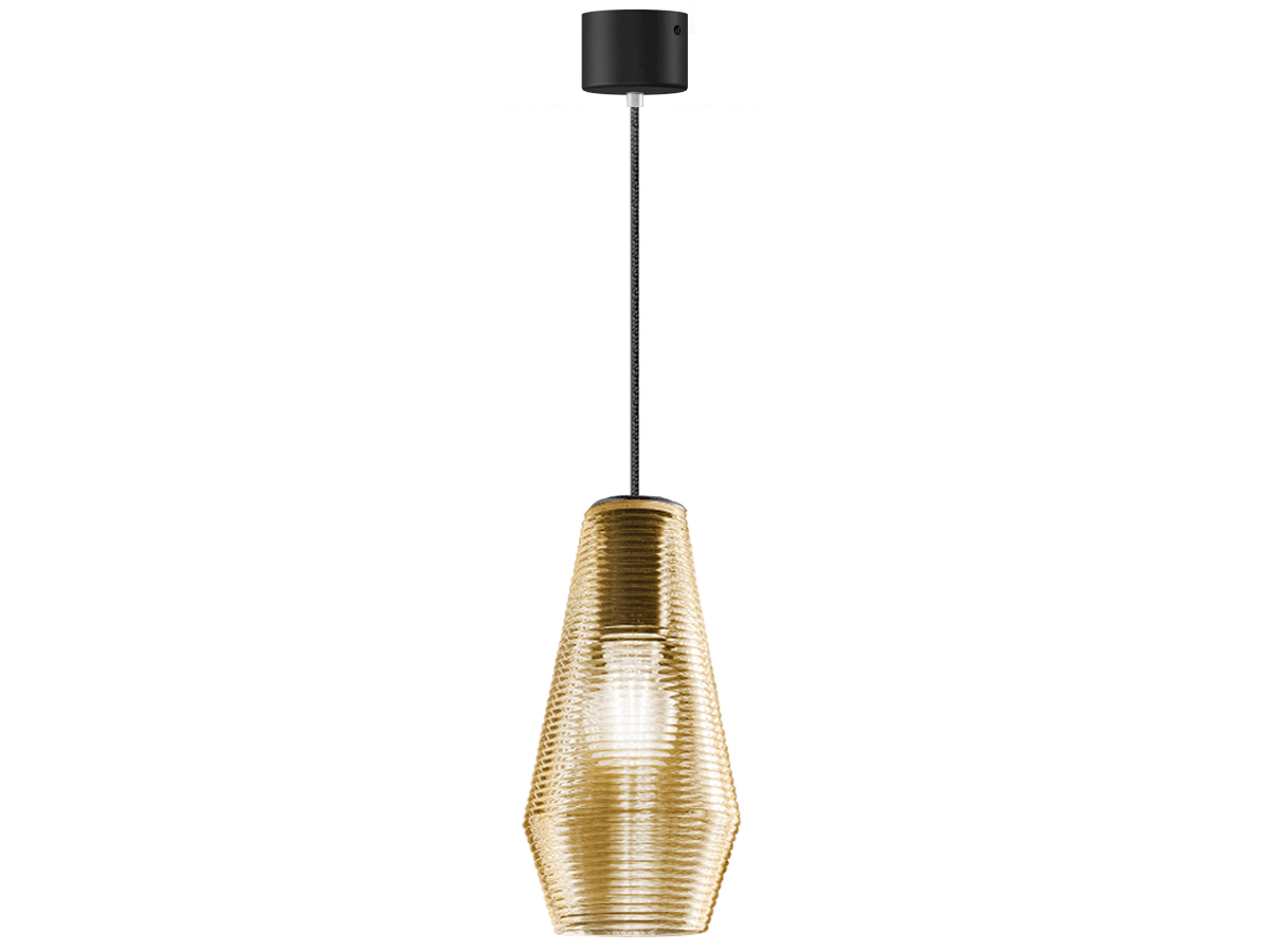 Lampada a sospensione in vetro soffiato con particolare finitura a coste dal gusto retrò. Rosone in metallo rifinito con vernice poliacrilica in color nero o nella nuova versione ottone satinato. Emissione di luce diffusa con attacco E27 e lampadina LED con filamenti a vista inclusa. Vetro soffiato disponibile in 7 colorazioni: cristallo, acciaio, ambra, bronzo, tabacco, verde e bianco lucido. Cavi elettrici in tessuto nero con possibilità di personalizzarne la lunghezza. Rosone a 8 uscite (+1 centrale). Ideale per strutture hospitality o zone living residenziali.