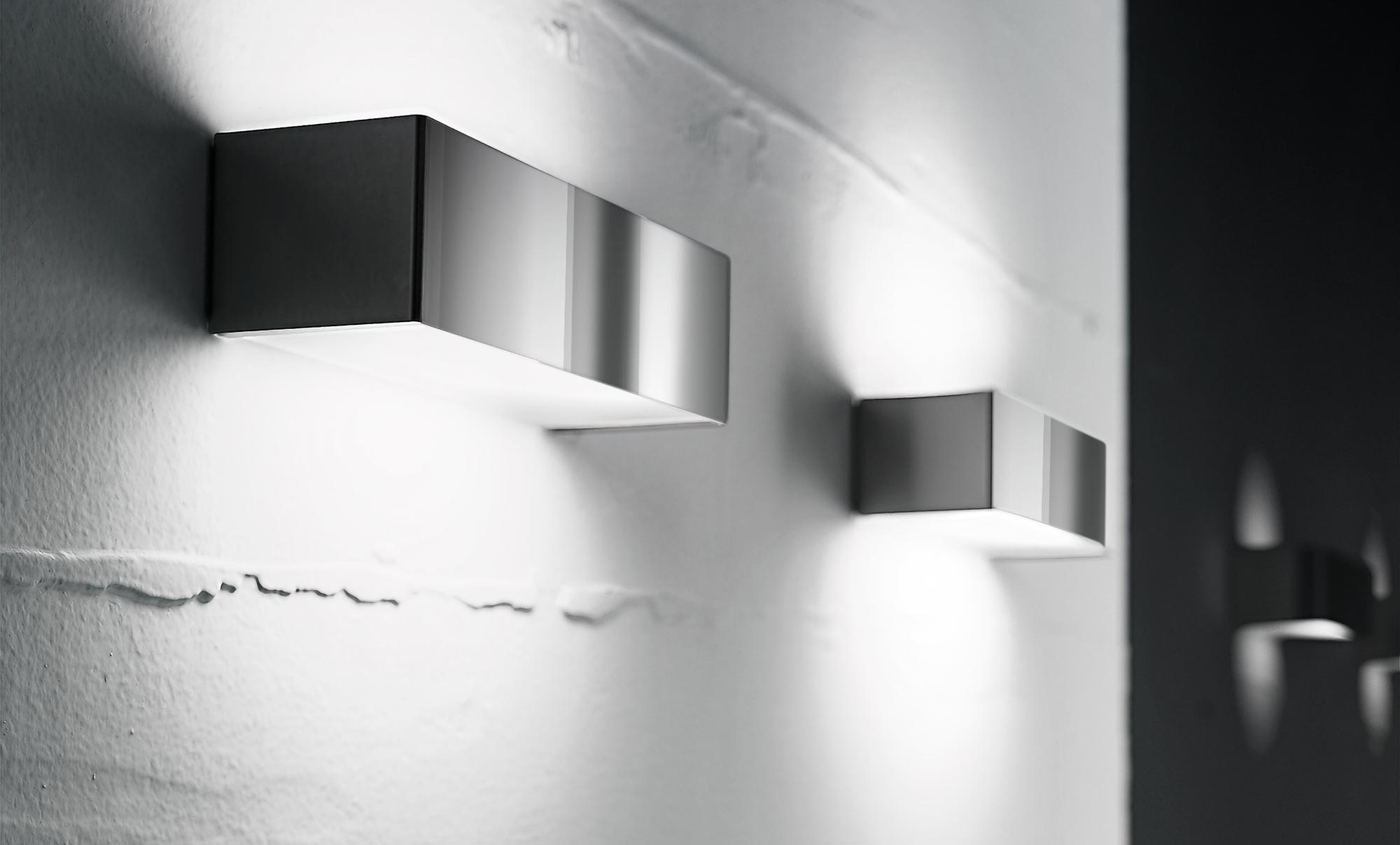 Lampade a parete con fascia in metallo o acciaio e diffusore in vetro. Emissione di luce diretta e indiretta ottenuta da una fonte luminosa LED. Fascia metallica rifinita con vernice poliacrilica in bianco, bronzo, ottone satinato o decorata a mano con foglia oro oppure fascia metallica in acciaio inox lucida o satinata. La fascia esterna non presenta viti a vista, perché fissata con meccanismo elastico. Lunghezze standard da 7 a 90cm. Ideale per ambienti residenziali e progetti moderni e minimalistici.