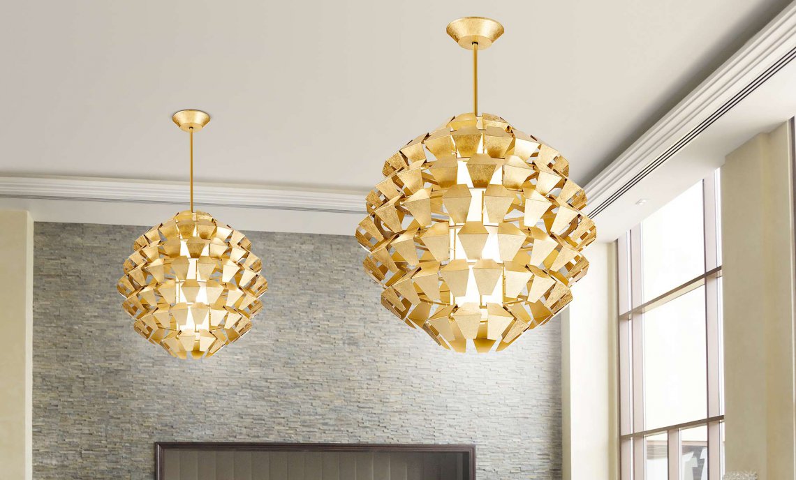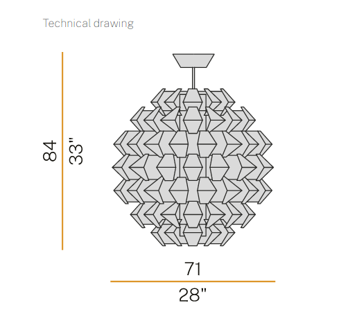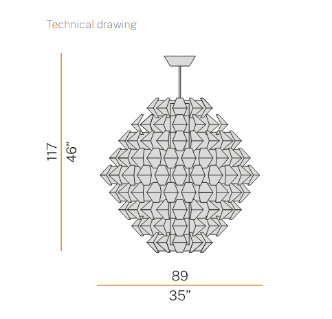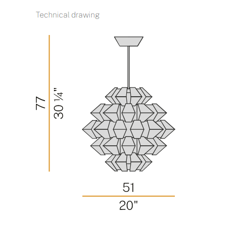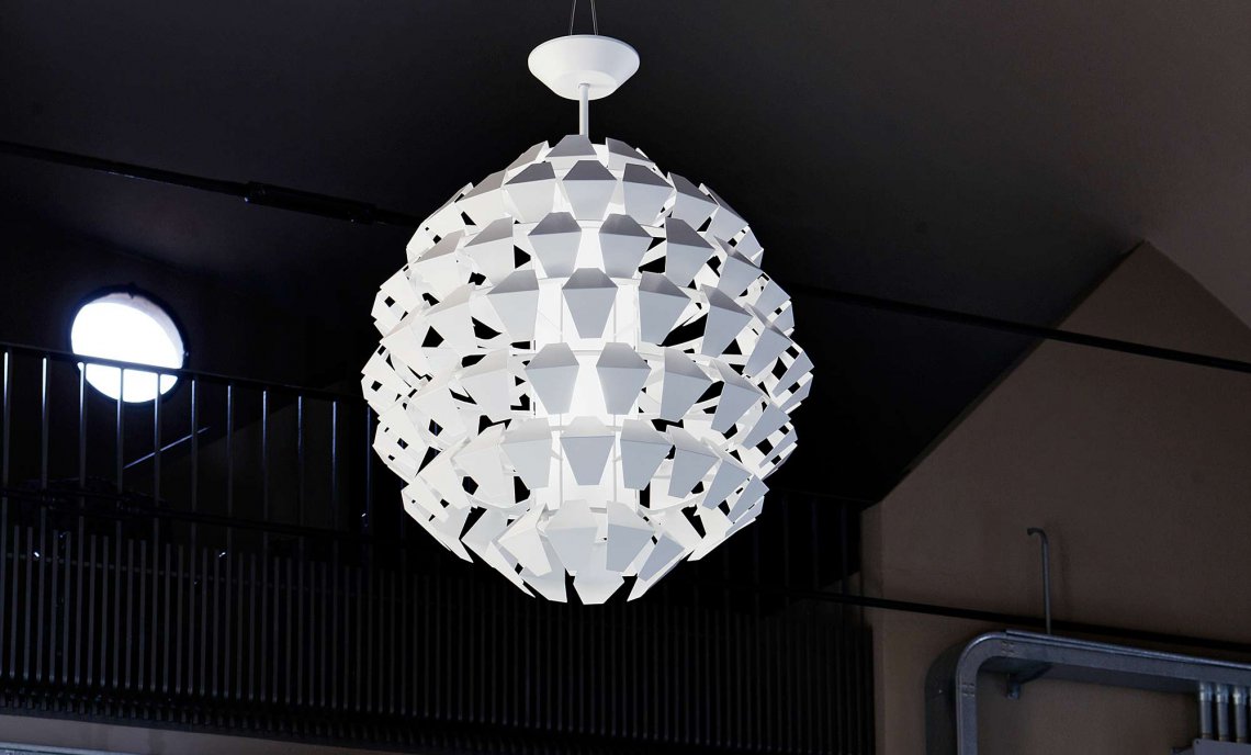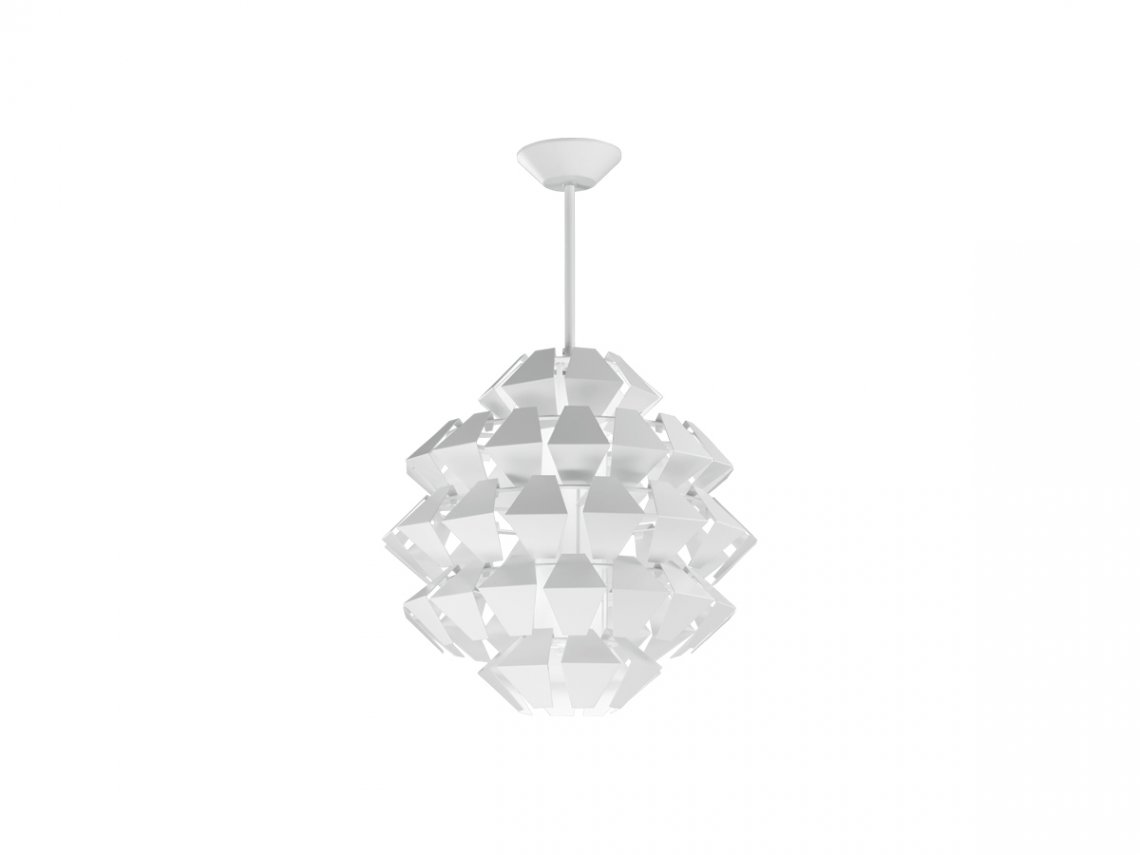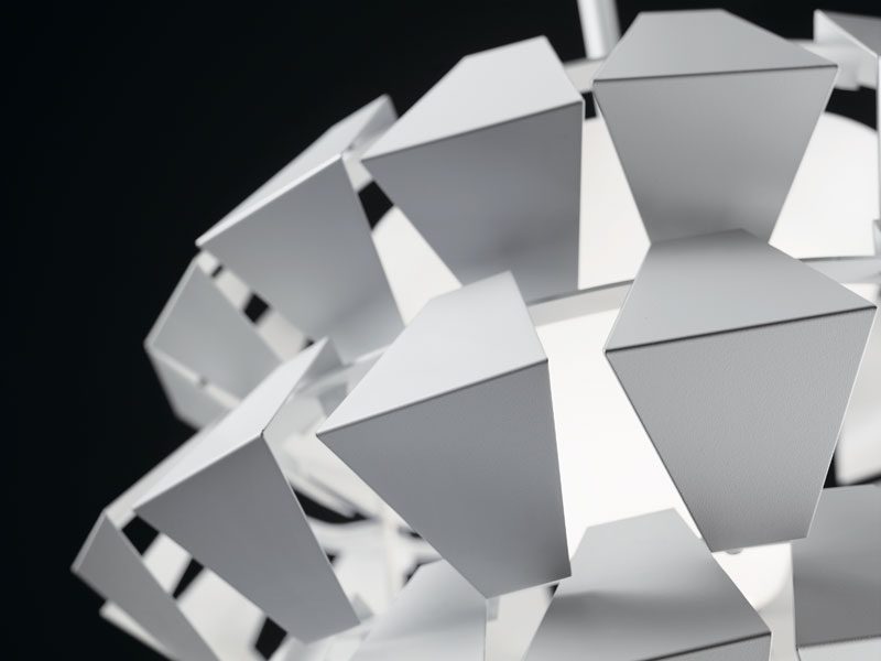 Suspensions, ceiling with pieces of white painted metal. On request gold, silver or copper leaf. Mat glass diffuser.