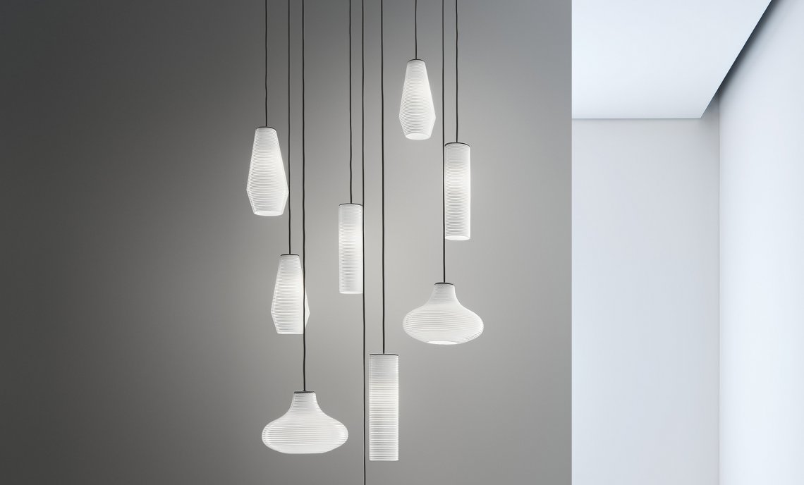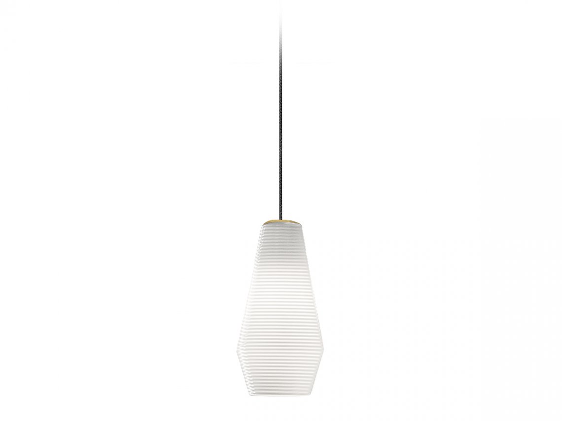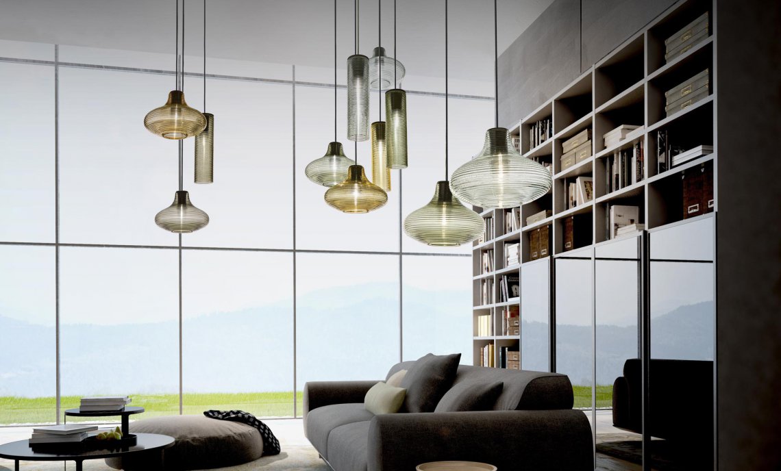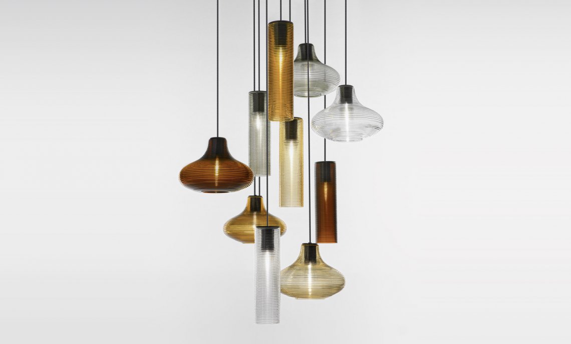 Suspension lamp with shaded blown glass with a retro style. Ceiling metal canopy in black polyacrylic paint and in mat brass. Diffused light in LED bulb E27 distinguished by visible filaments. Seven colors glass available: crystal, steel, amber, bronze, tobacco, green and glossy white. Black fabric electrical cables and possibility to customize the lenght. Canopy with 8 outputs (+1 in the center). Ideal for hospitality or residential facilities.