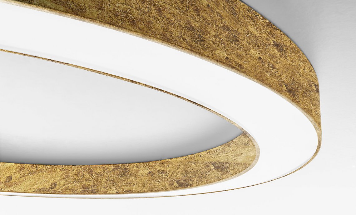 Aluminium ring with bottom high-transmittance screen in opal polycarbonate. Available in wall/ceiling and suspension versions. Emission of direct light provided by LED module with technology DALI/Push DIM on all versions. Ring eventually finished in polyacrilic paint white, black, bronze or hand-decorated in golden leaf. Custom colors are available on request. Suspended version supplied with 3 steel cable adjustable in lenght (6 cables for 180cm). The wall/ceiling version is supplied with a simplified mounting kit. Ideal for residential use, compositions for offices, hospitality facilities and public spaces. Delivery of the product in a single piece already assembled.