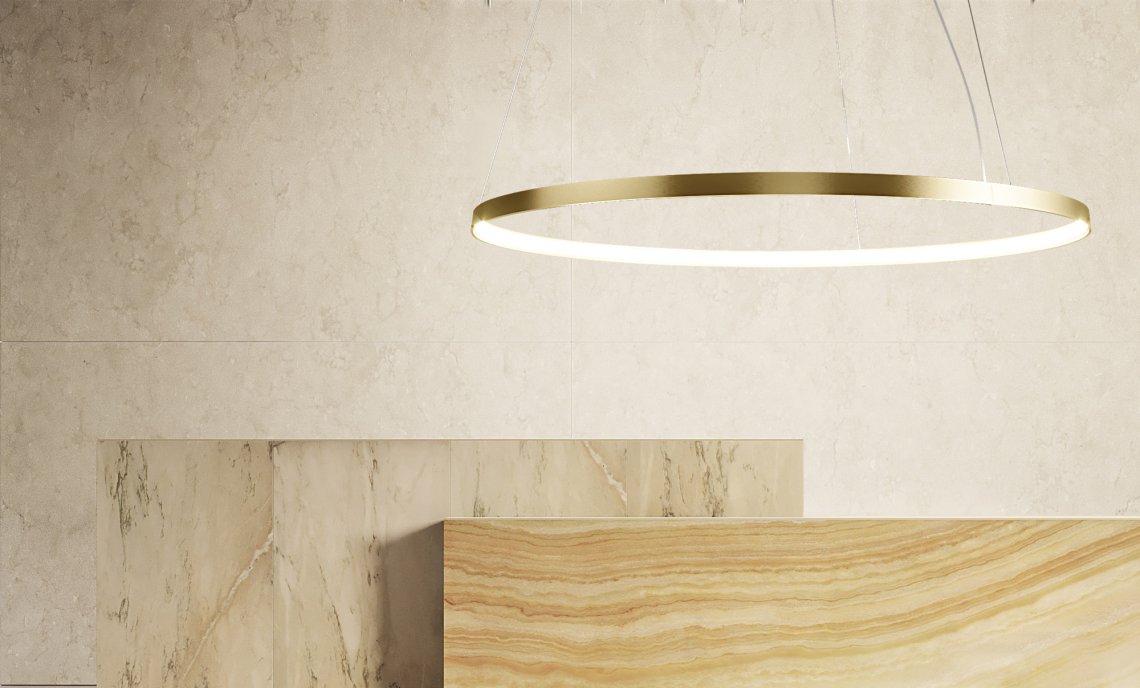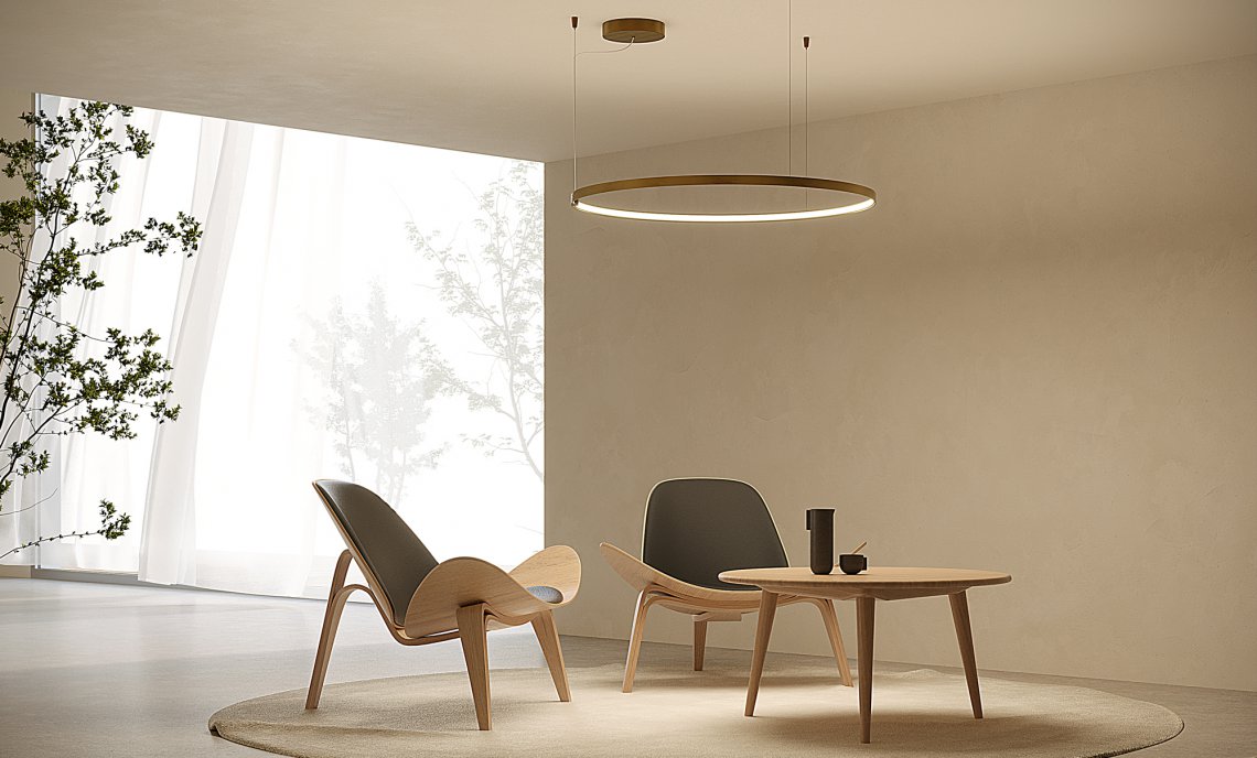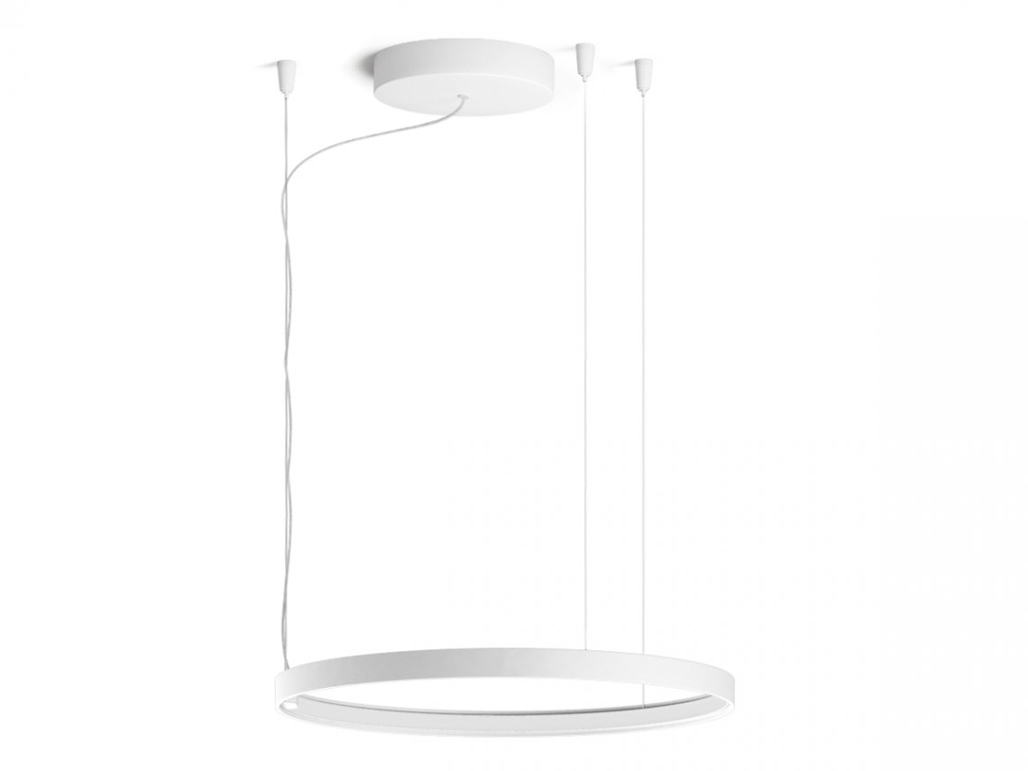Horizontal suspension lamp in extruded curved aluminum, with opal polycarbonate screen. Emission on the internal side provided by LED modules with ZigBee technology integrated into the canopy. Polyacrilic paint white, black, titanium, bronze and mat brass finishes are available. Ideal for residential spaces and living areas.