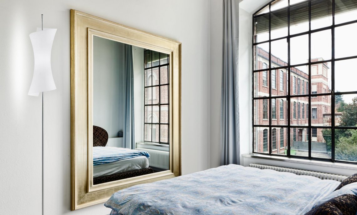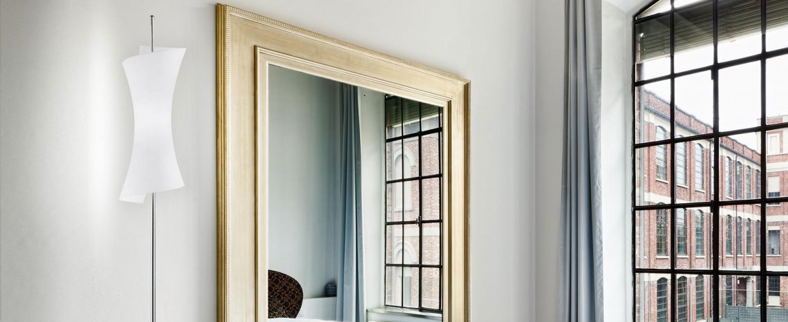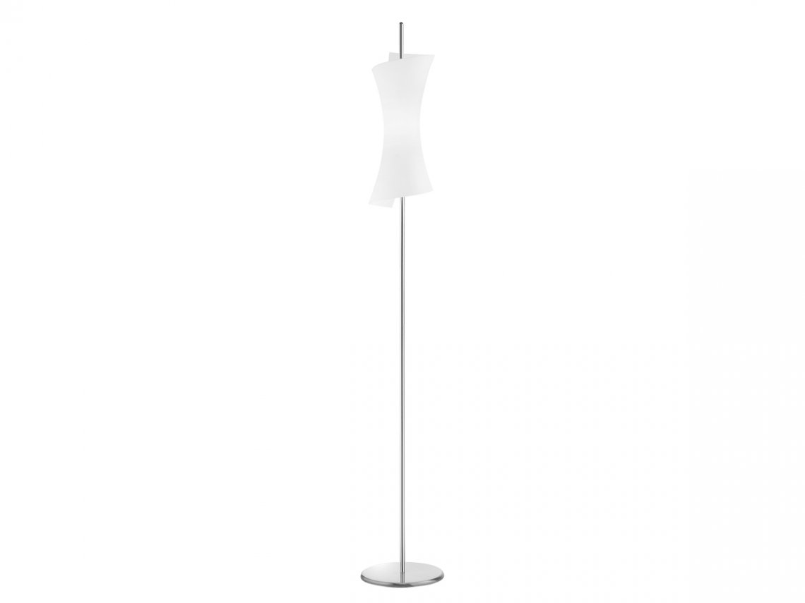 Table, floor, suspension and wall lamps in mat titanium metal colour. Blown white mat glass.