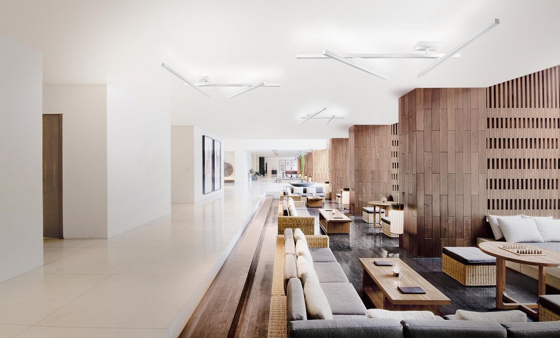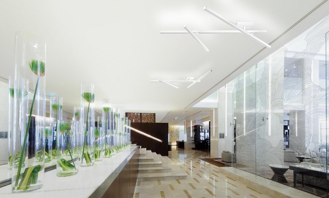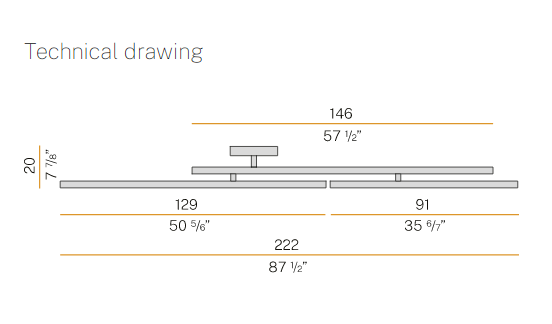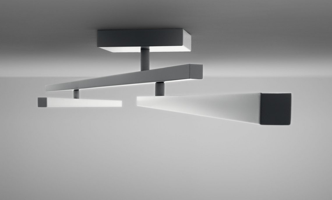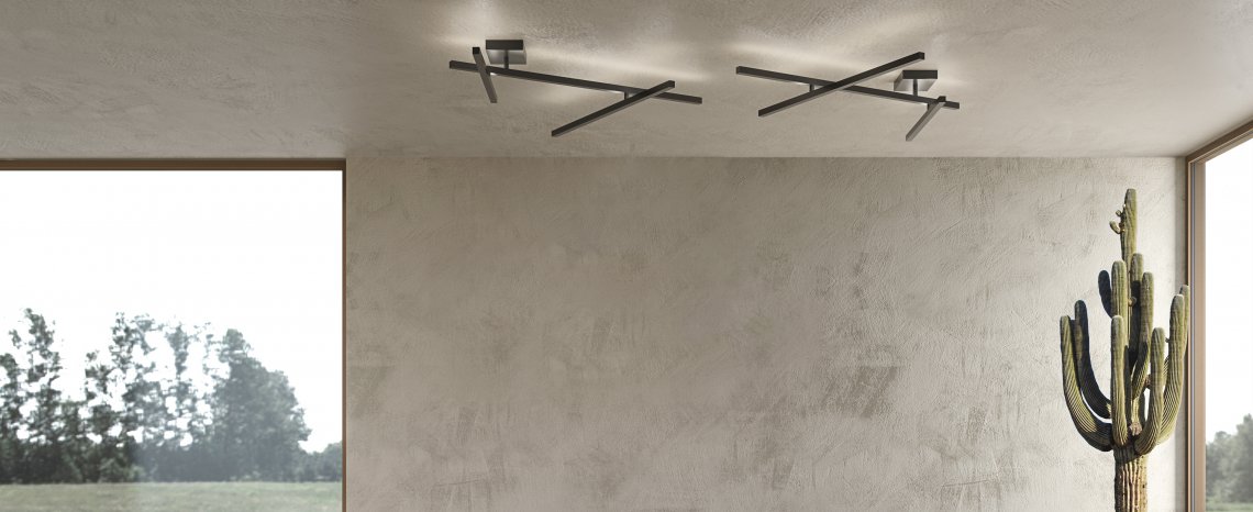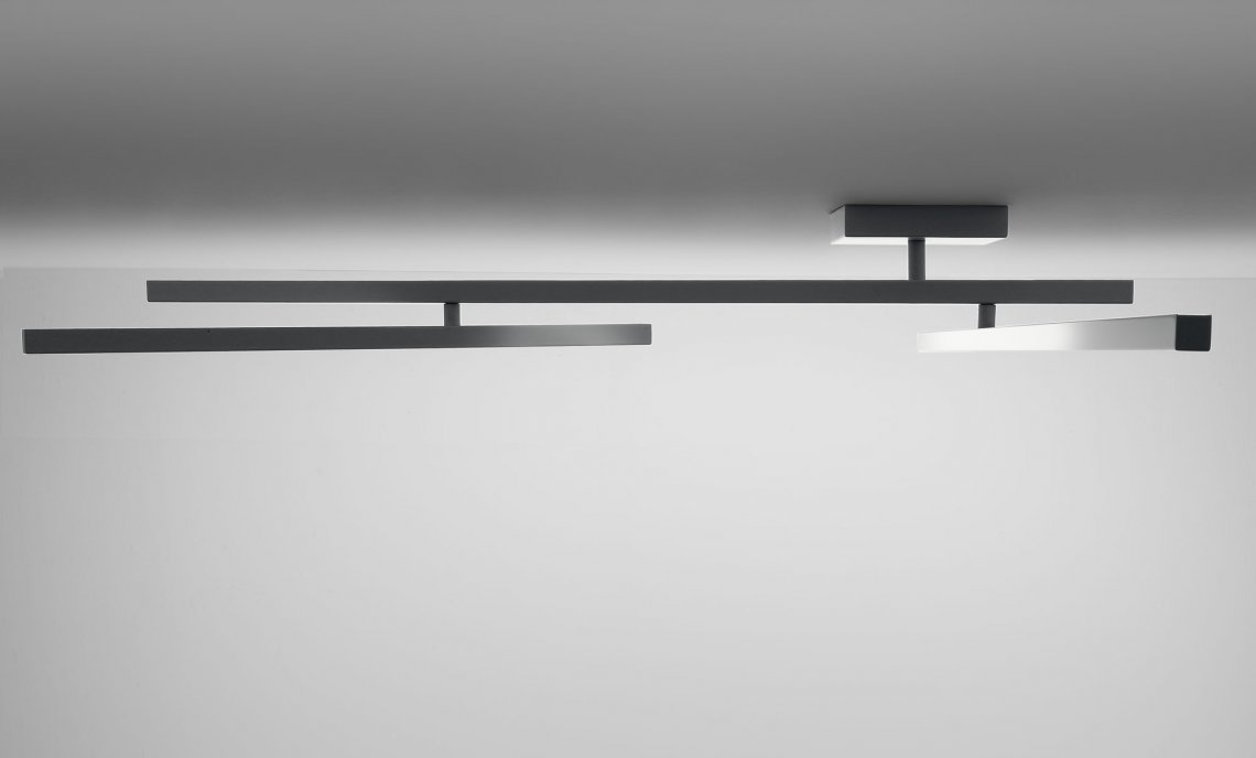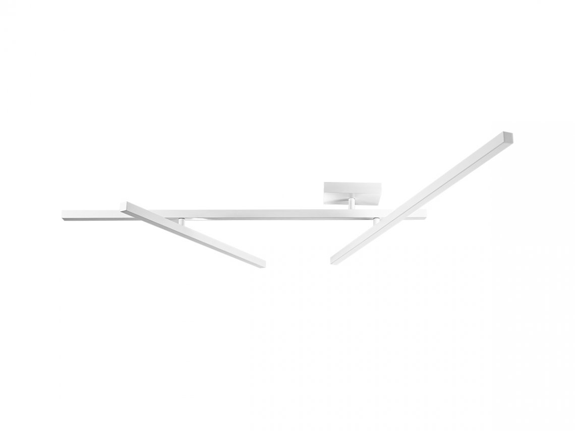 Ceiling or wall lamp in laser-cut metal folded and then welded with silver thread. The ceiling version has a rotary mechanism turned from solid. Indirect light through transparent screen. Light source consisting of LED module. The version with 3 arms is provided with dimming 1-10V/Push DIM driver. Lamp painted in white or black polyacrylic paint. The ceiling version has 2 or 3 rotating sections (350°), while the wall version is a fixed section. Ideal for large rooms difficult to illuminate.