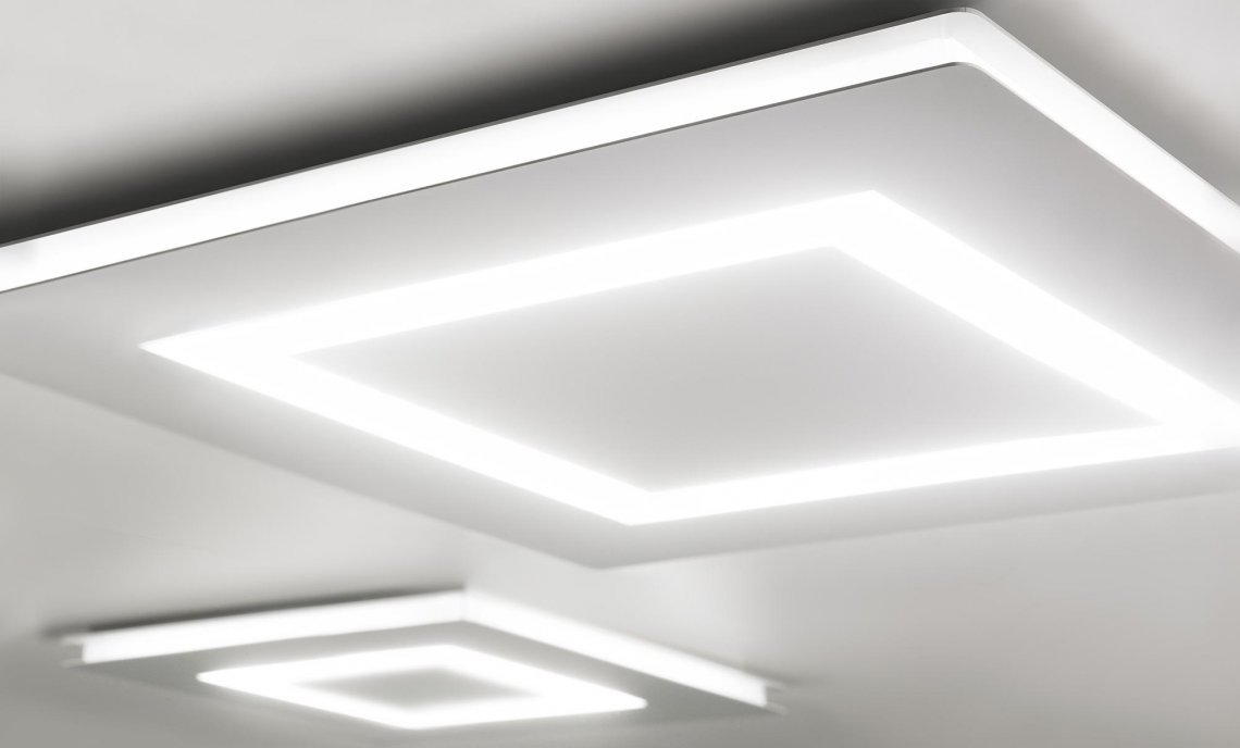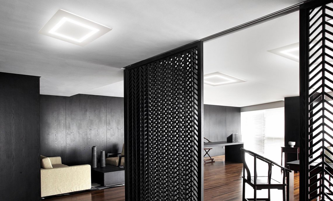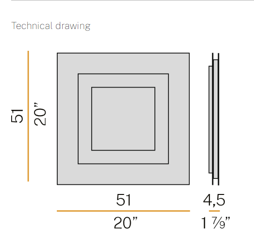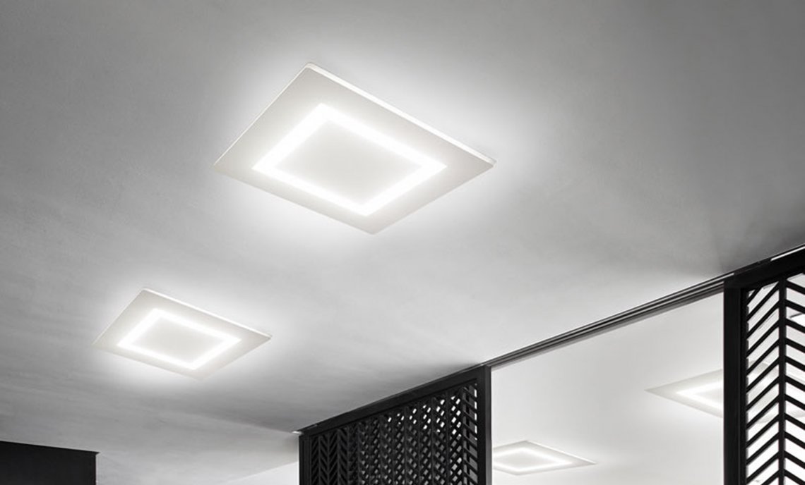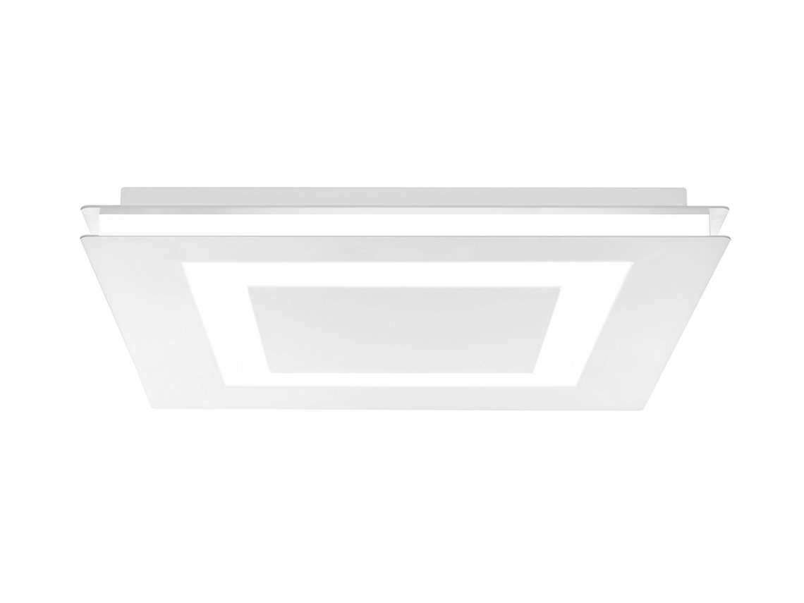 Wall/ceiling and recessed version (the latter only in the 60x60cm size) metal lamps. Front and side screens are each a sole opal polycarbonate piece. Direct light obtained by LED module. Available emergency light of 1h/12h for the recessed version. Supplied with DALI/Push DIM dimmer only in the 51cm version. Fixture in white polyacrylic paint. Available in gold/ silver leaf on request. Original luminescent lateral perimeter. The recessed version is set up for standard modular ceiling. Ideal for residential or office use.