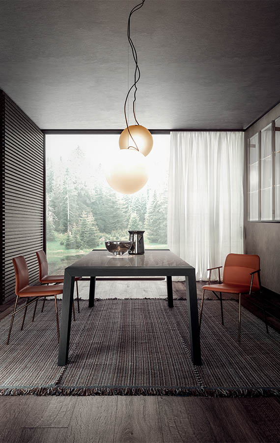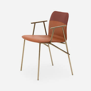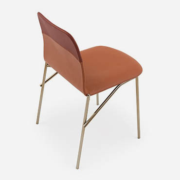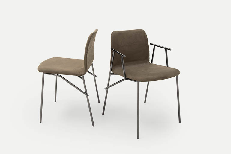 Emilio Nanni’s creativity and experience have come together in Alunna, the ideal companion to the Maestro table, with which it shares the inspirational and conceptual blueprint. The distinguishing trait shared by both designs is the segment, seen as a primary geometric entity and as an iconic structural element. In the Alunna chair, the contrast between the reticular structure of the base and the soft seat creates a striking marriage: pure, refined, sophisticated. The four tubular legs connect together, echoing the design of the Maestro’s legs, but adopting a less radical, less angular solution: the metal finishes highlight their delicate intertwining and set off the padded upholstered seat. The stitching detail and two-tone upholstery give Alunna an eloquent appeal, making it a desirable object for any room of the home as well as an embellishing addition to the office.