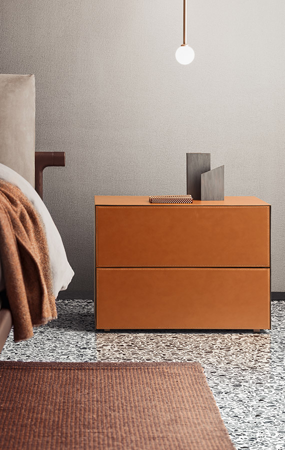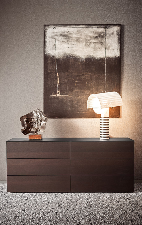 Minimalist in every detail, Norma features a push-to-open mechanism designed to access the contents of its large and practical drawers. A vast assortment of finishes is available to embellish the outside of these cabinets: new leathers and bronze metallic glass add to the classic matt or gloss lacquers, glass, mirror, wood and stone of the Pianca collection. The base, available in three different heights, can be added if desired.